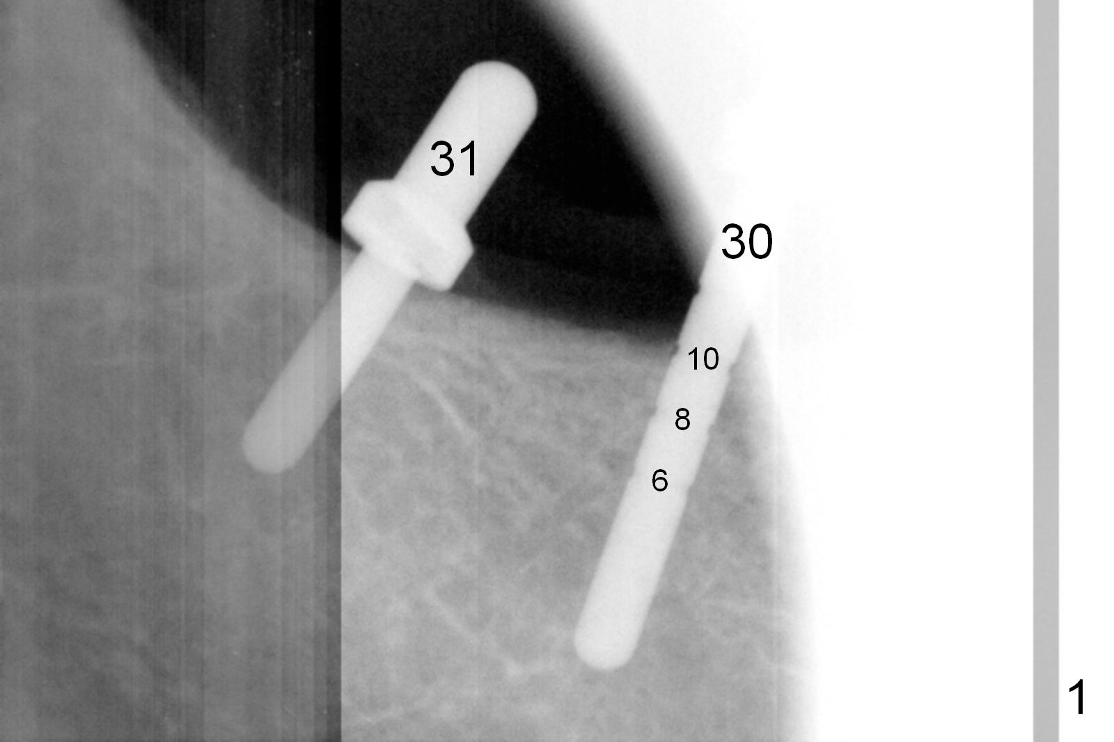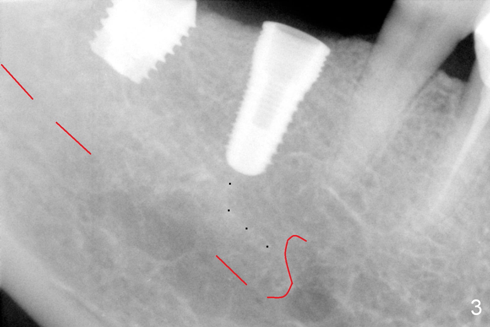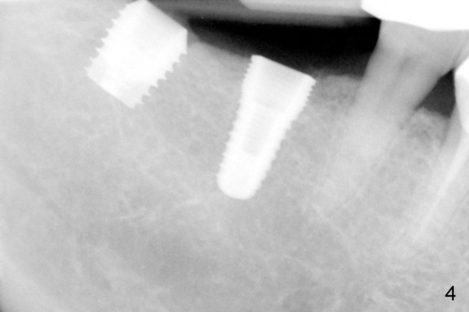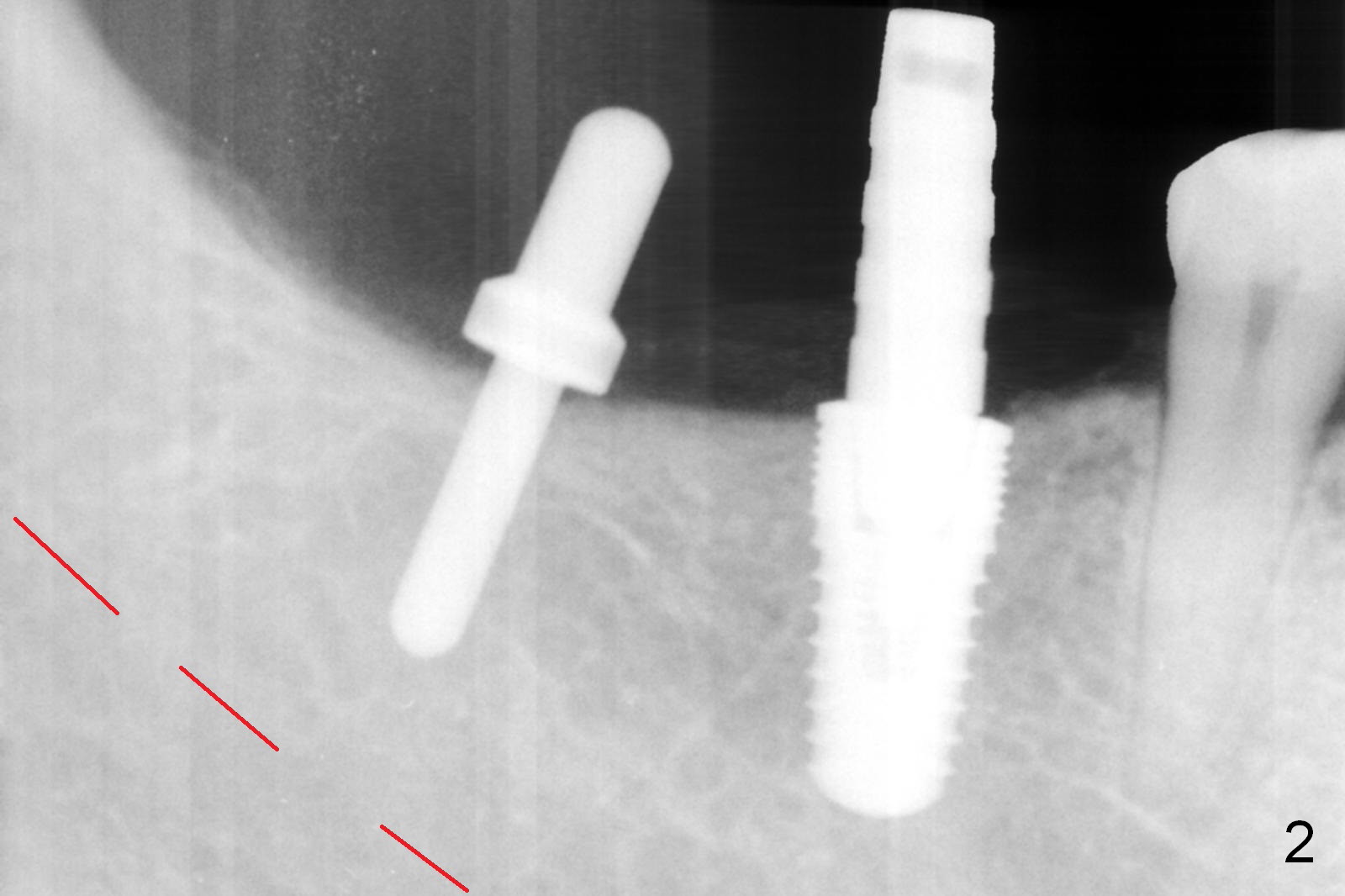After vacation, the nervous patient returns for #30, 31 implant placement. After infiltration anesthesia, initial osteotomy goes on smoothly at the depth of 10 and 8 mm, respectively (Fig.1). Depth gauge post 5x10 mm drilling shows that the distal osteotomy at #30 is 14 mm in spite of depth control (using drill stopper). Damage the Inferior Alveolar Canal or Mental Loop? Since hemorrhage is moderate, a 5x10 mm submerged implant is placed without discomfort from the patient (Fig.2); when the osteotomy at #31 is being enlarged with 2/2.7 mm pilot drill at 8 mm, the patient experiences severe pain without any obvious reason. The infiltration anesthesia is increased with Articaine and Marcaine. The depth of the osteotomy reduces at 6 mm. The osteotomy and 5.9x6 mm implant placement is done in a slow and gentle manner (Fig.3,4). The bone density mesioapical to the implant at #30 is low (Fig.3 dot line, Fig.5 (CBCT, ≤50 units) *)). This may account for apparent increase in the osteotomy at #30. The soft bone gives in to the depth gauge!