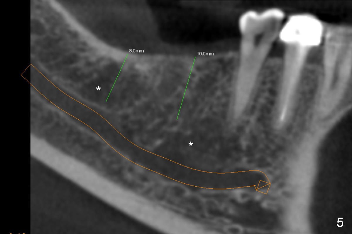 How to explain pain and discomfort of osteotomy and implant placement at #31 in spite of large clearance from the Inferior Alveolar Canal (Fig.3 red dashed line)? Still the low bone density theory. The low bone density (Fig.5 * at #31) makes it easy to transmit the heat and vibration associated with the osteotomy to the underlying nerve!