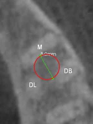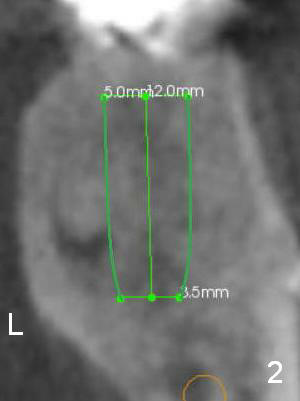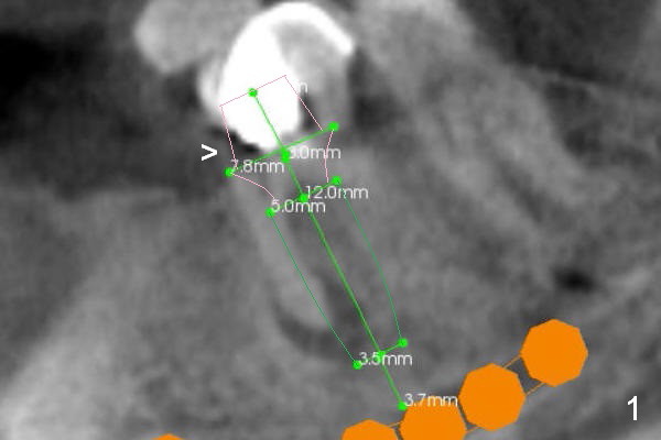 A 40-year-old man will return to clinic for #19 implant placement, probably due to crown fracture (Fig.1 (CT sagittal section) >: open margin of PFM crown). In fact implants have been placed at #20 and 21. After extraction of #19 and socket debridement without antibiotic, a 5x12 mm implant is to be placed in the tripod septum (Fig.2 (coronal section; L: lingual),3 ((axial section) M: mesial; DB: distobuccal; DL: distolingual (root)). An abutment with the largest diameter (7.8 mm) will be chosen to close the socket as much as possible (Fig.1 pink). Bone density is high (600-900 U). Drills will be used for osteotomy. The initial depth is 12 mm with stop on the septal crest. Take photos preop to show residual roots.