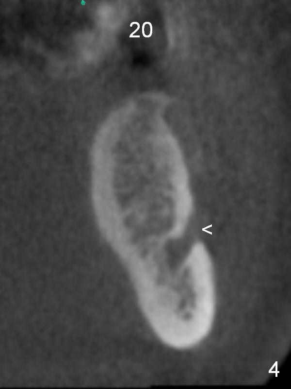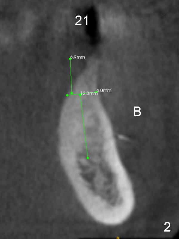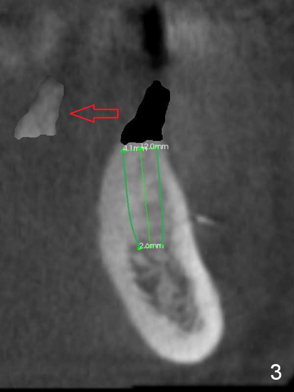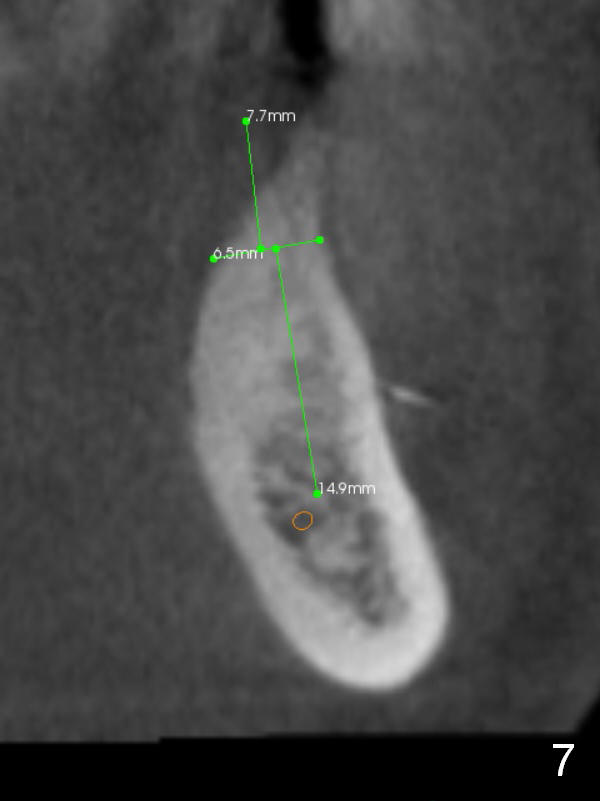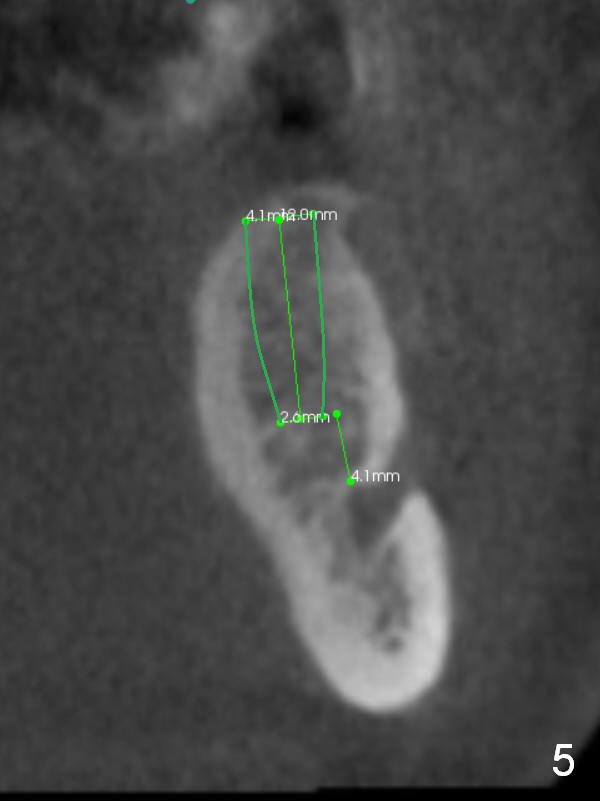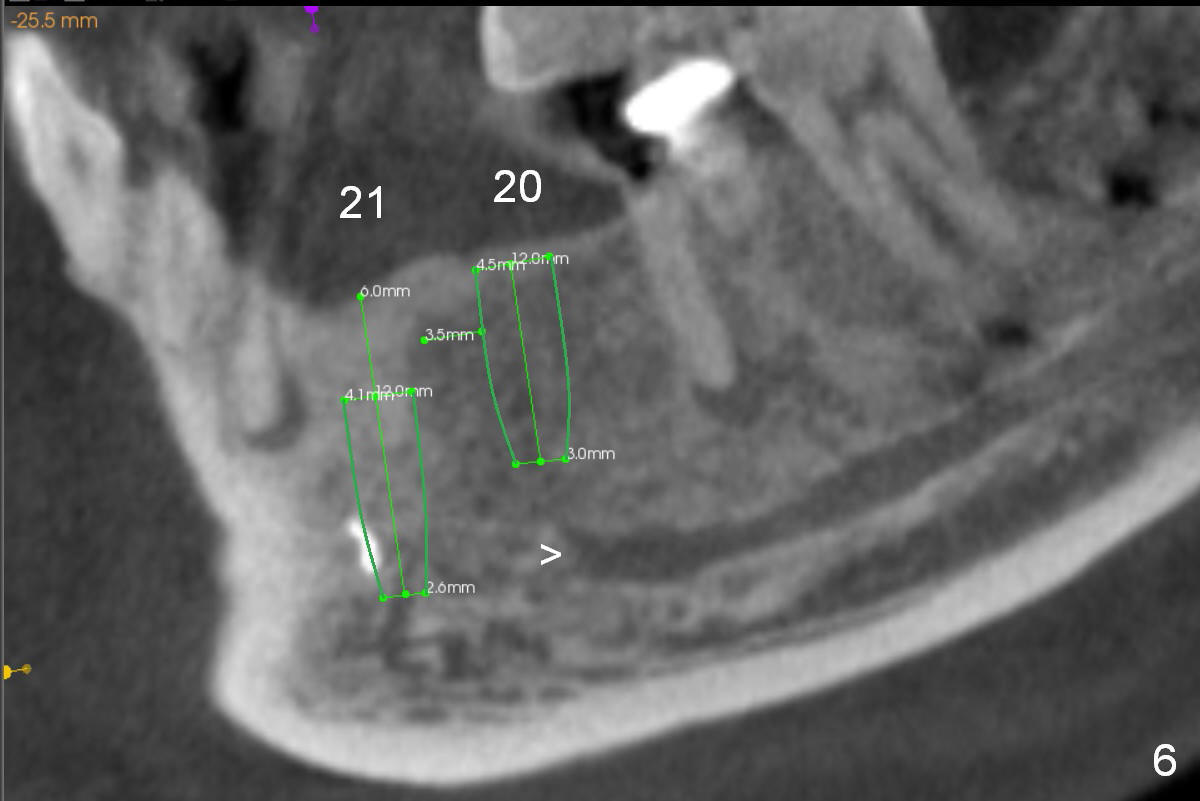 A 39-year-old man is pleased with implant placement at the lower right premolars (Fig.1: #28,29). He wants to have the same treatment at the lower left (#20,21), although the neighboring teeth need more urgent treatment. CBCT coronal sections at #21 (Fig.2) and 20 (Fig.4) show that the crest at the 1st premolar is particularly narrow and pointed. Since the Mental Foramen is at the 2nd premolar (arrowhead in Fig.4, 6 (sagittal section)), it seems appropriate to resect the atrophic crest by 6-7 mm at #21 (Fig.3 black area) and place a narrow implant low. It may invade the Incisive Nerve (Fig.7 brown cicle), which should be insignificant. A long abutment is expected at #21. A regular implant and abutment are expected at the 2nd premolar, similar to the right side. Smaller implants may be more appropriate (3.8 mm) to reduce postop bone resorption. In fact, the patient cracks the tooth #31. It seems to be nonsalvageable. In fact, what is to be done?