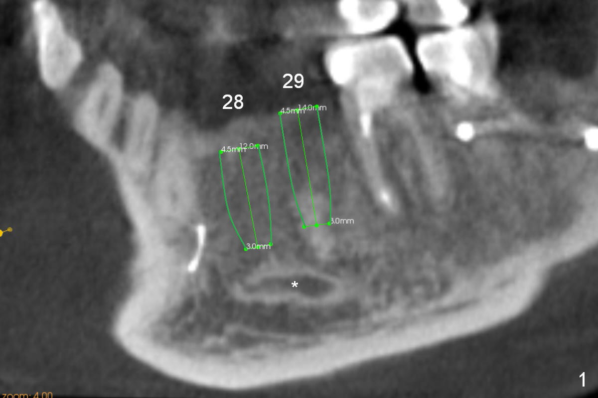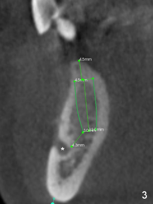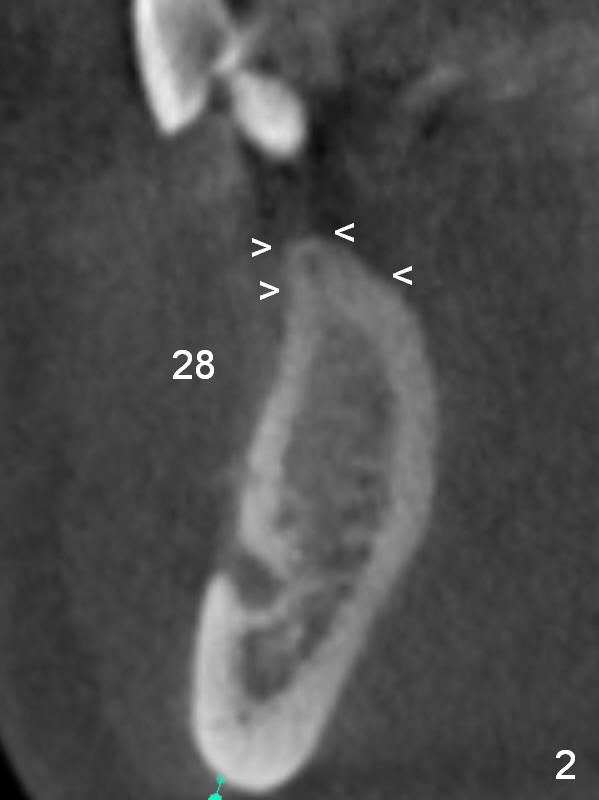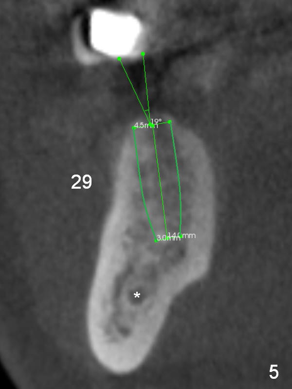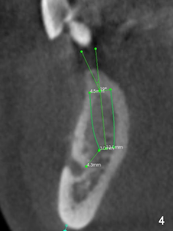 A 39-year-old man had an accident, which caused loss of several teeth 20 years ago. The patient (wearing removable partial dentures) decides to restore #28,29 with implants first (Fig.1 CBCT sagittal section). Coronal section at #28 shows narrow ridge coronally (Fig.2). To place an implant, the pointed ridge top has to be removed about 4.5 mm (Fig.3). Probably due to severe bone resorption post extraction, an angled abutment may be needed as much as 20 degree (Fig.4).