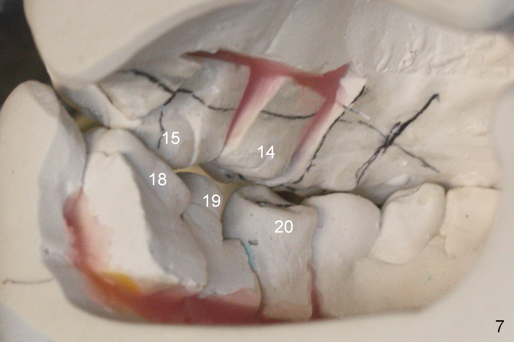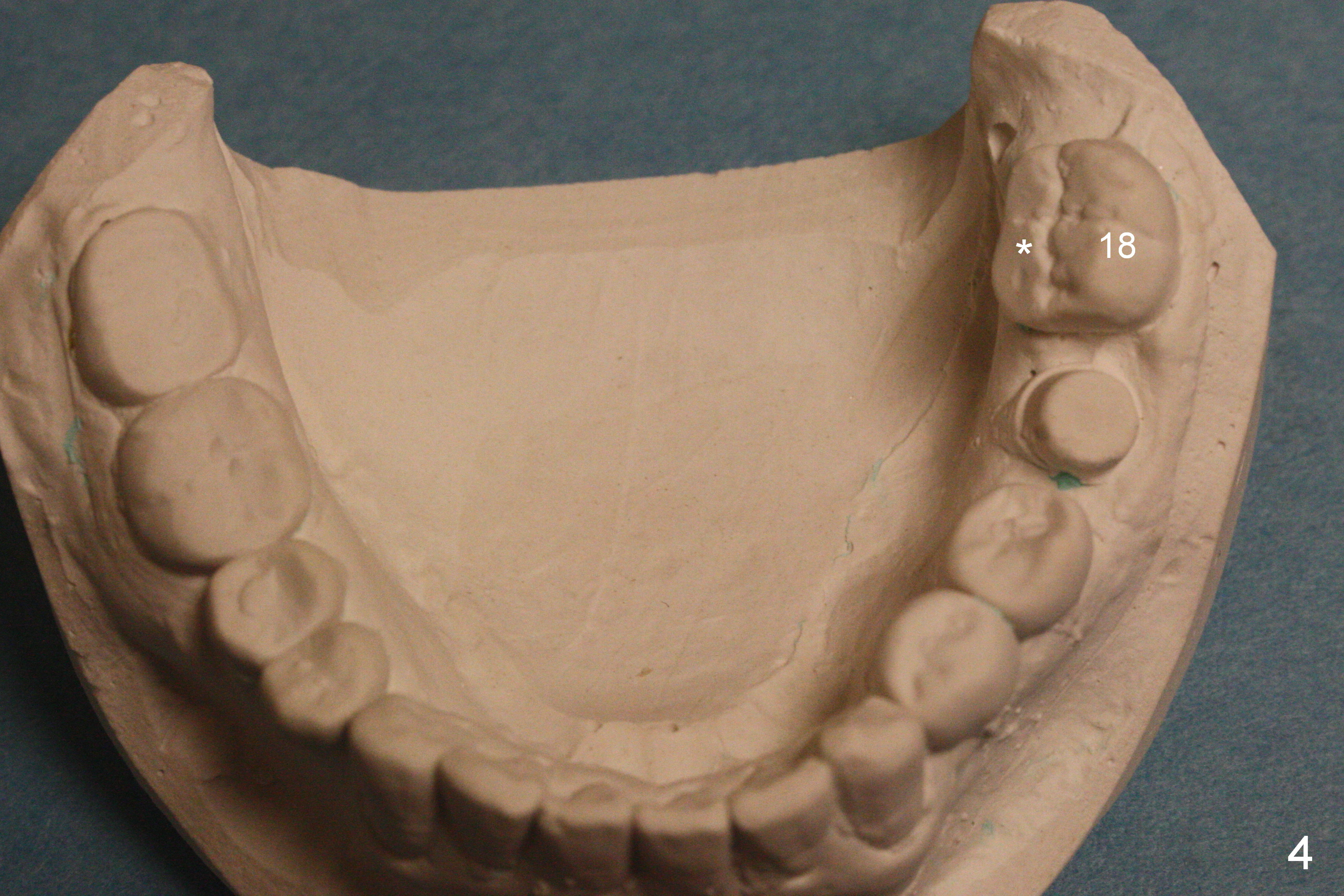A 40-year-old man had automobile-related mandibular fracture and surgical reduction several years ago. Since then there has been cross bite in the left molar region (Fig.1-2) with abnormal wear facets in the occlusal surface of the teeth #14, 15 and 18 (Fig.3,4 *). At the time of implant placement at #19, the patient reports tooth sensitivity at #15 and wonders whether increase in the occlusal surface of the future crown at #19 can alleviate the tooth sensitivity or not. In fact the tooth #14 and 19 were in cross bite when the sites of #20 and 21 were processed for implant crowns (Fig.1). The cross bite of the left molar area appears to be so severe that surgical segmental osteotomy or orthodontic treatment is required (Fig.5-7).