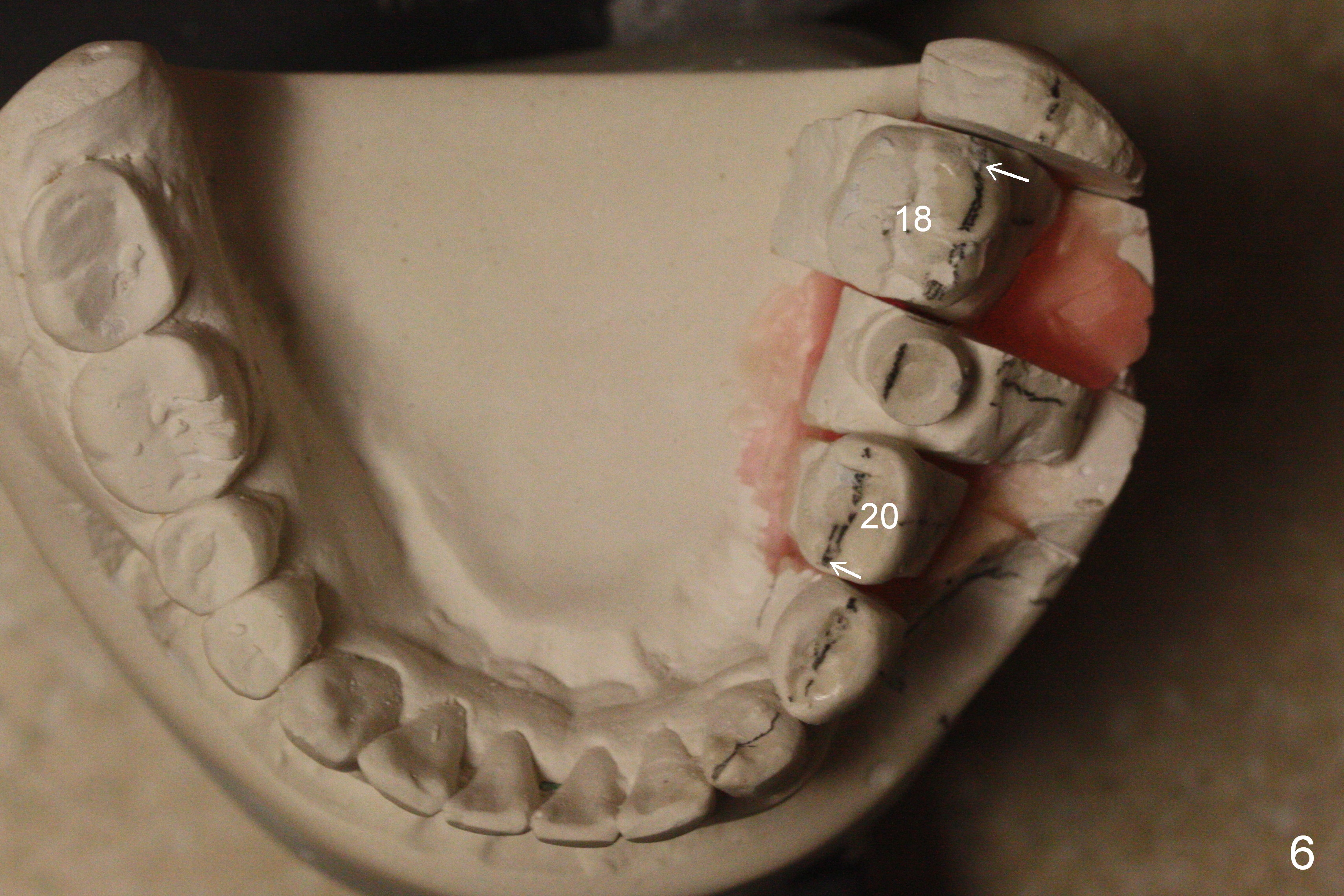 In the lower arch, the buccal surface of the crowns at #20 and 21 is reduced substantially so that the crowns functions as lingual anchorage. The abutment at #19 will be changed to an angled one; in the same way, the temporary crown at #19 is lingually positioned. With full arch brackets and bands, the tooth #18 is expected to be lingualized (Fig.6 arrows). Elastics can be placed between the left upper and lower molars (from upper lingual to lower buccal) to facilitate mutual shifting.