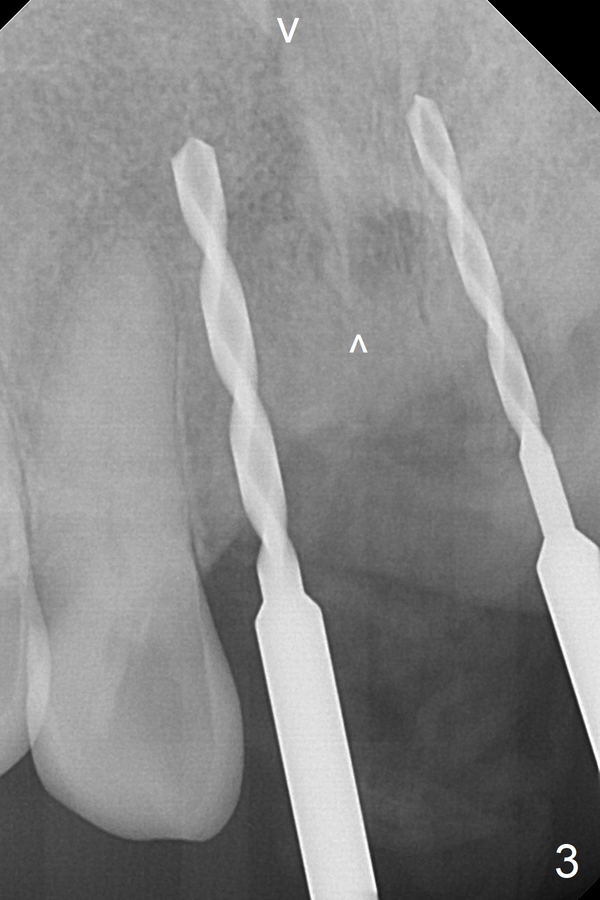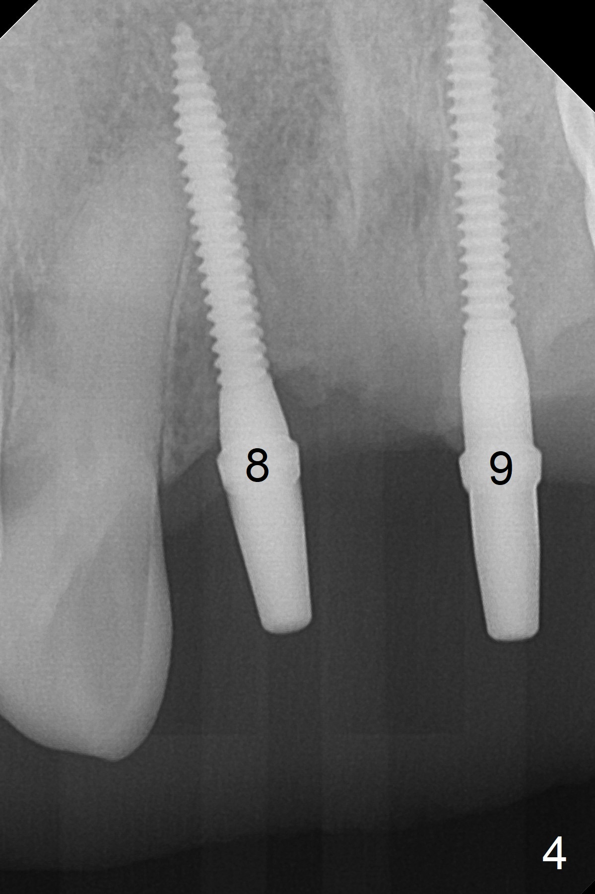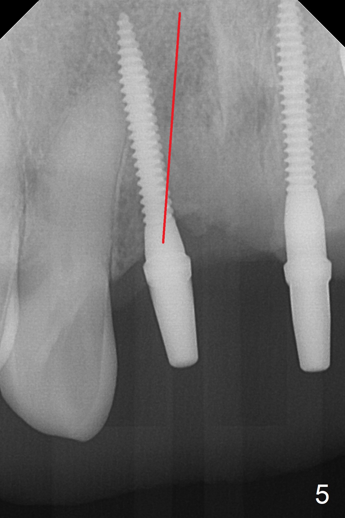 For implant placement of the atrophic ridge (Fig.1), osteotomy starts at #8 and 9 (Fig.2). Change in trajectory at #8 seems acceptable (Fig.3 (arrowheads: upper midline suture)). But it relapses when a 2x14(2) mm implant is placed (Fig.4 (2x14(4) mm at #9)). It appears that a drastic change in trajectory is necessary (Fig.5). In fact it is difficult to change the trajectory with the flexible 1.2 mm drill. Lindamann bur can be used for this purpose initially (coronally). The osteotomy should be moved mesially prior to reuse of the 1.2 mm drill for depth.