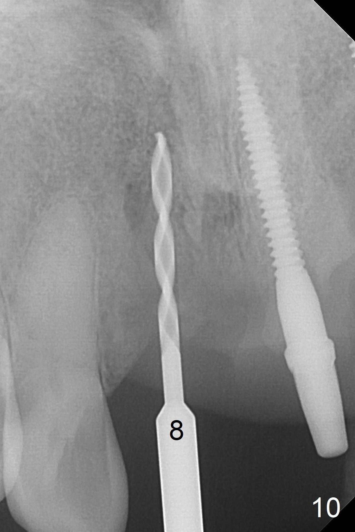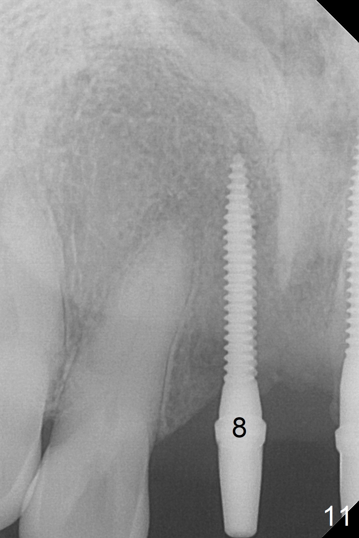 Change in trajectory at #8 seems acceptable (Fig.3 (arrowheads: upper midline suture)). But it relapses when a 2x14(2) mm implant is placed (Fig.4 (2x14(4) mm at #9)). It appears that a drastic change in trajectory is necessary (Fig.5). In fact it is difficult to change the trajectory with the flexible 1.2 mm drill. Lindamann bur can be used for this purpose initially (coronally). The osteotomy should be moved mesially prior to reuse of the 1.2 mm drill for depth (Fig.10) and re-placement of the 2x14(2) mm implant (Fig.11).