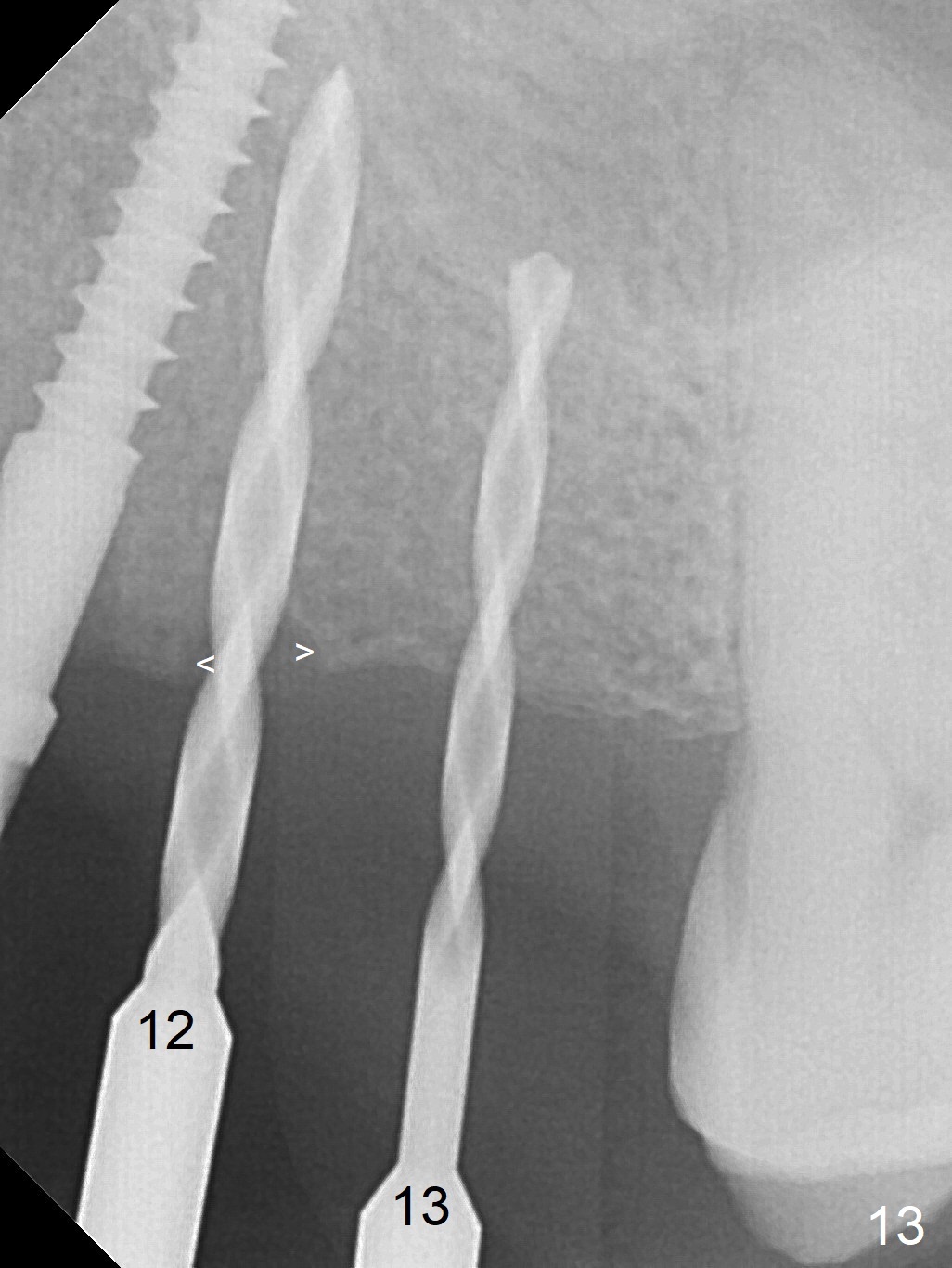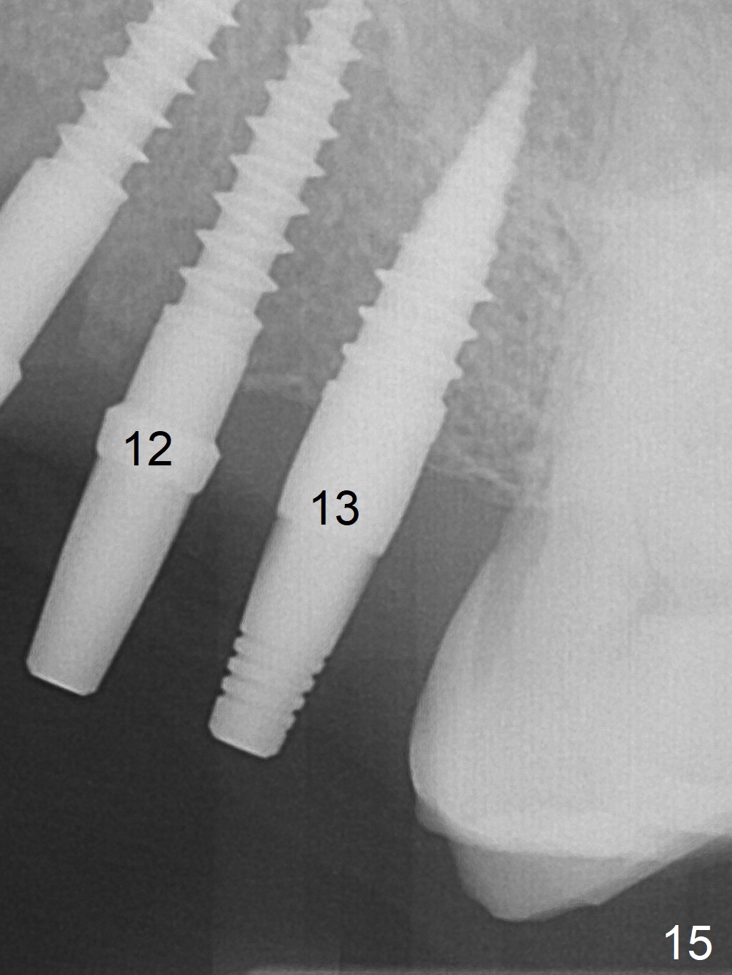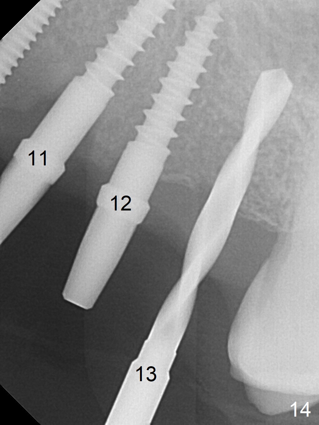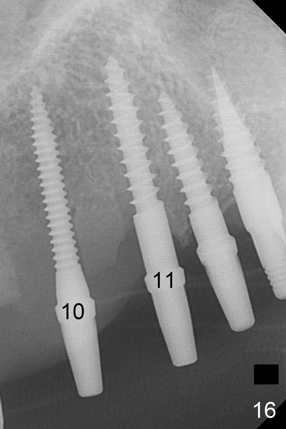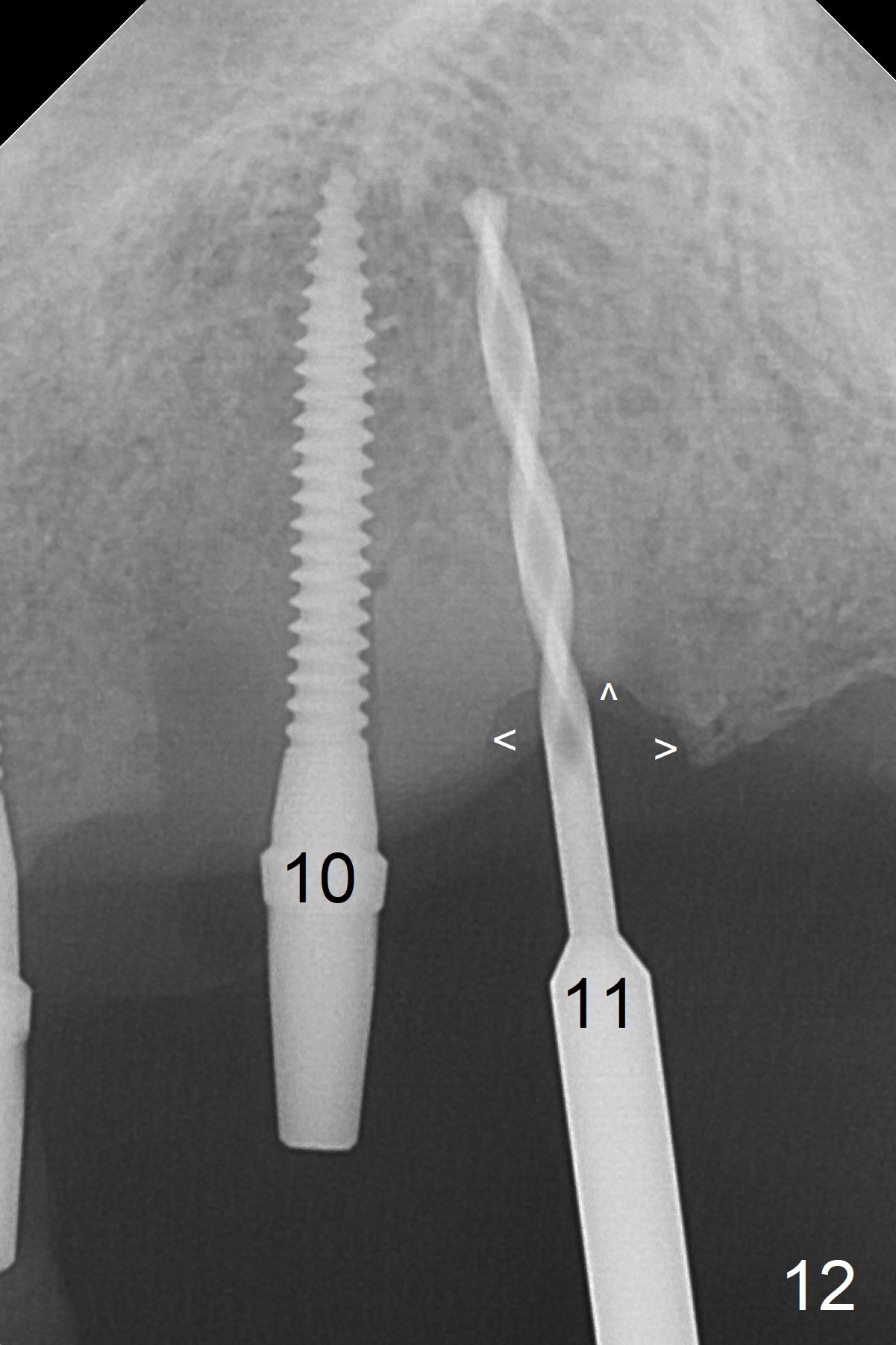 At the sites of #11 and 12, the knife-edged ridge is trimmed prior to initiation of osteotomy (Fig.12,13). With the flattened ridge, it is easy to start osteotomy and control the mesiodistal position. When the position and the trajectory are not correct, they can be changed (Fig.14-16) with 2.5x14(4), 2.5x12(2) and 3x10(2) mm implants placed at #11,12, and 13, respectively. With relatively correct position of each implant, it would be easy to fabricate a splinted 6-unit provisional.