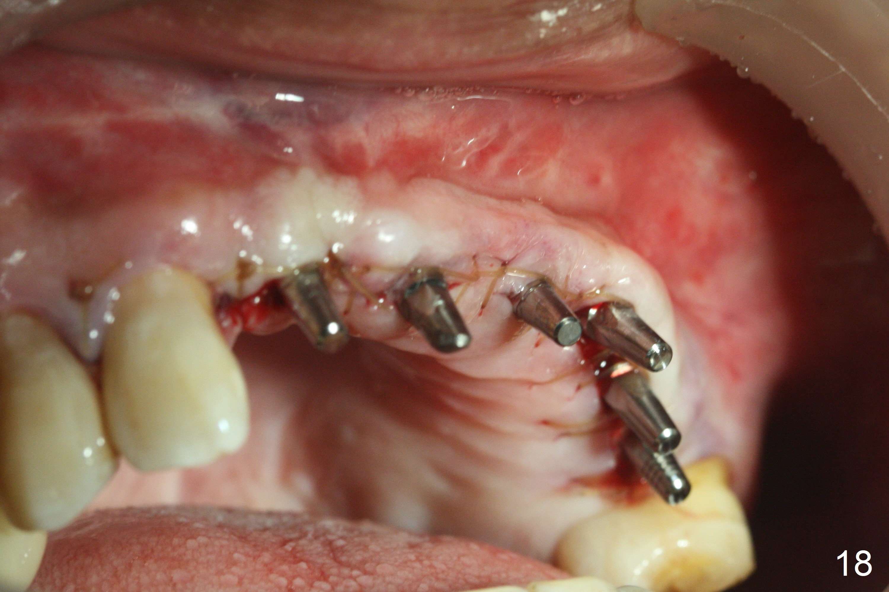 Following allograft placement around the implants (particularly palatally and in void due to change in osteotomy position) and PRF membrane buccopalatally, the ridge looks wider (Fig.17, 18) than preop (Fig.1). Note scar tissue in the upper labial vestibule (history of trauma). Continuous mattress suturing provides good wound closure.