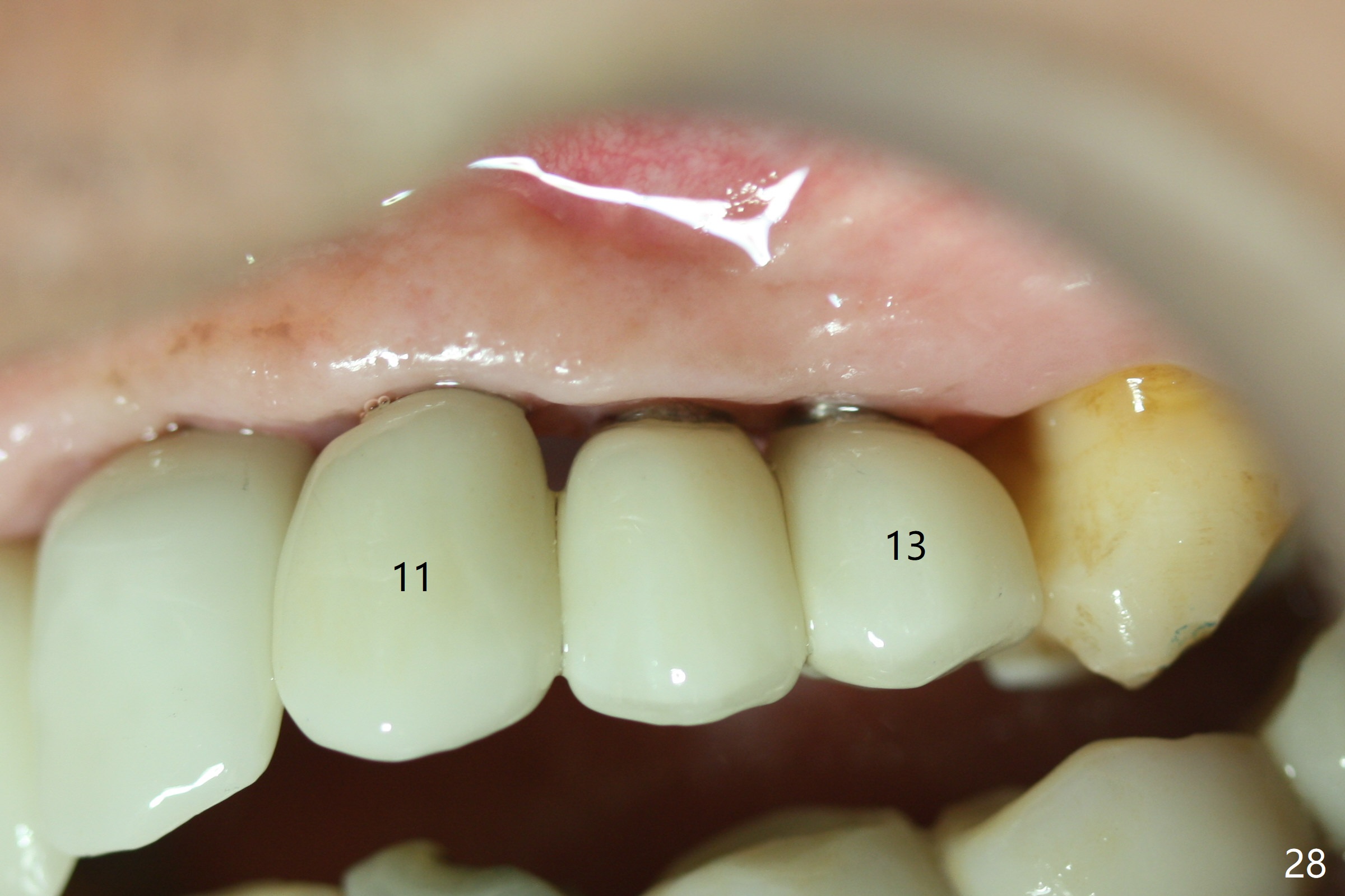 The gingiva remains healthy with use of water pik at #8-10 (4 months post cementation) and at #11-13 (immediately post cementation (1 year 2 months postop, Fig.27,28), while bone loss is minimal (Fig.29-31). The patient is pleased with convenience of the fixed restoration.