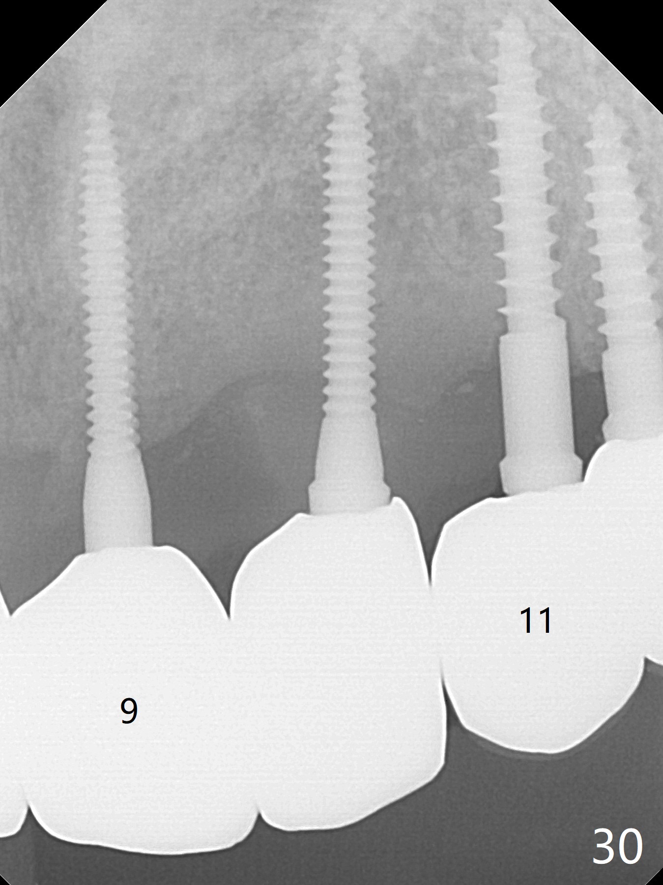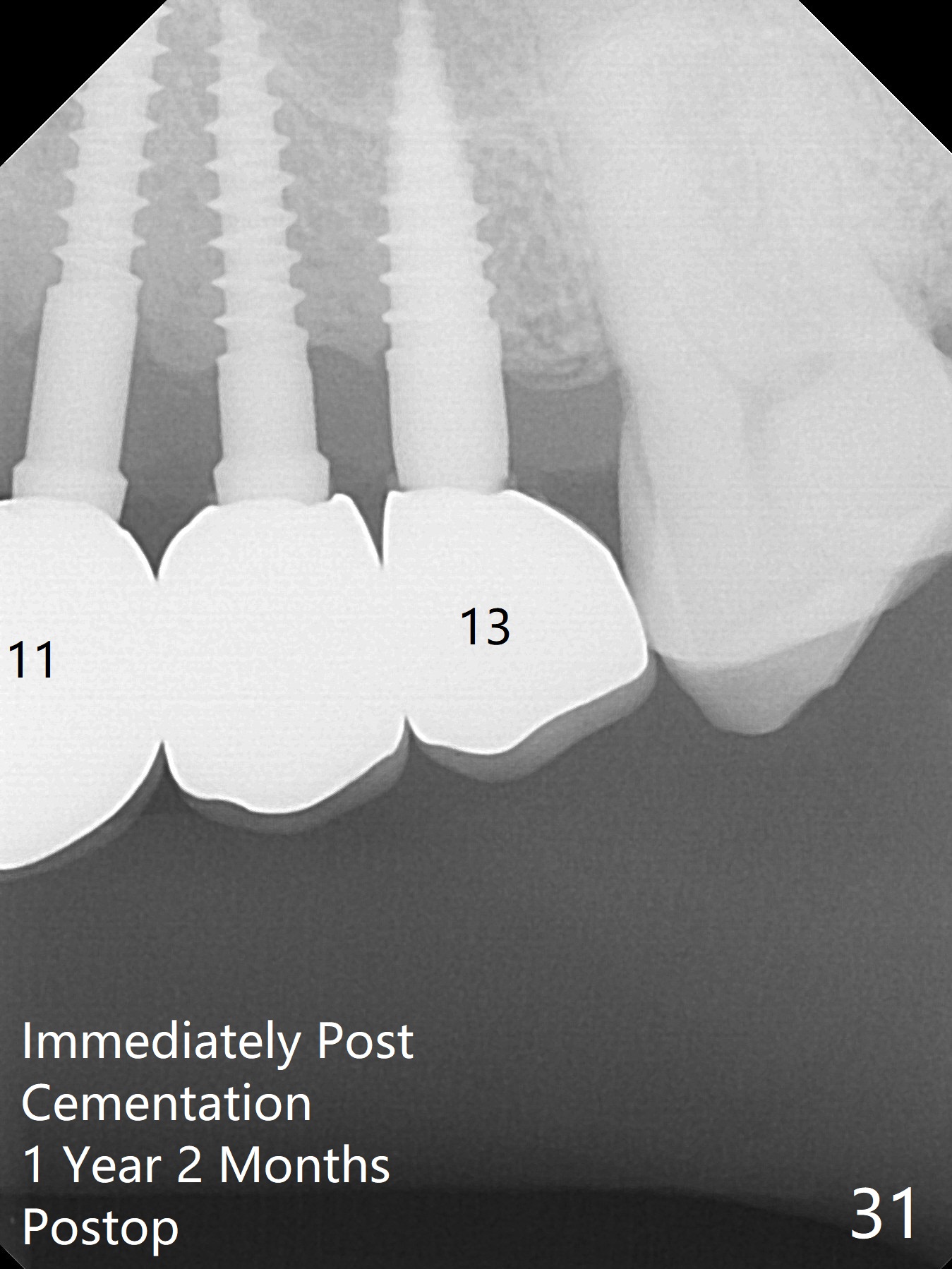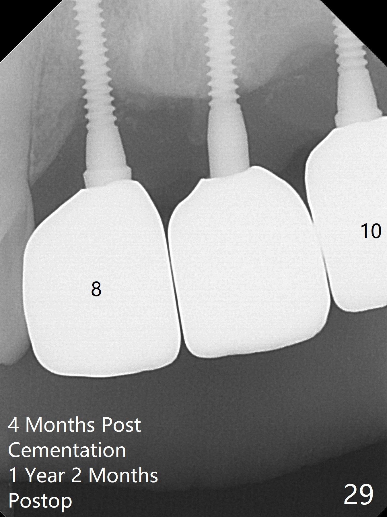 The gingiva remains healthy with use of water pik at #8-10 (4 months post cementation) and at #11-13 (immediately post cementation (1 year 2 months postop, Fig.27,28), while bone loss is minimal (Fig.29-31, although the crowns at #8 and 9 received trauma from child head immediately post cementation with tenderness for 1-2 months). The patient is pleased with convenience of the fixed restoration.