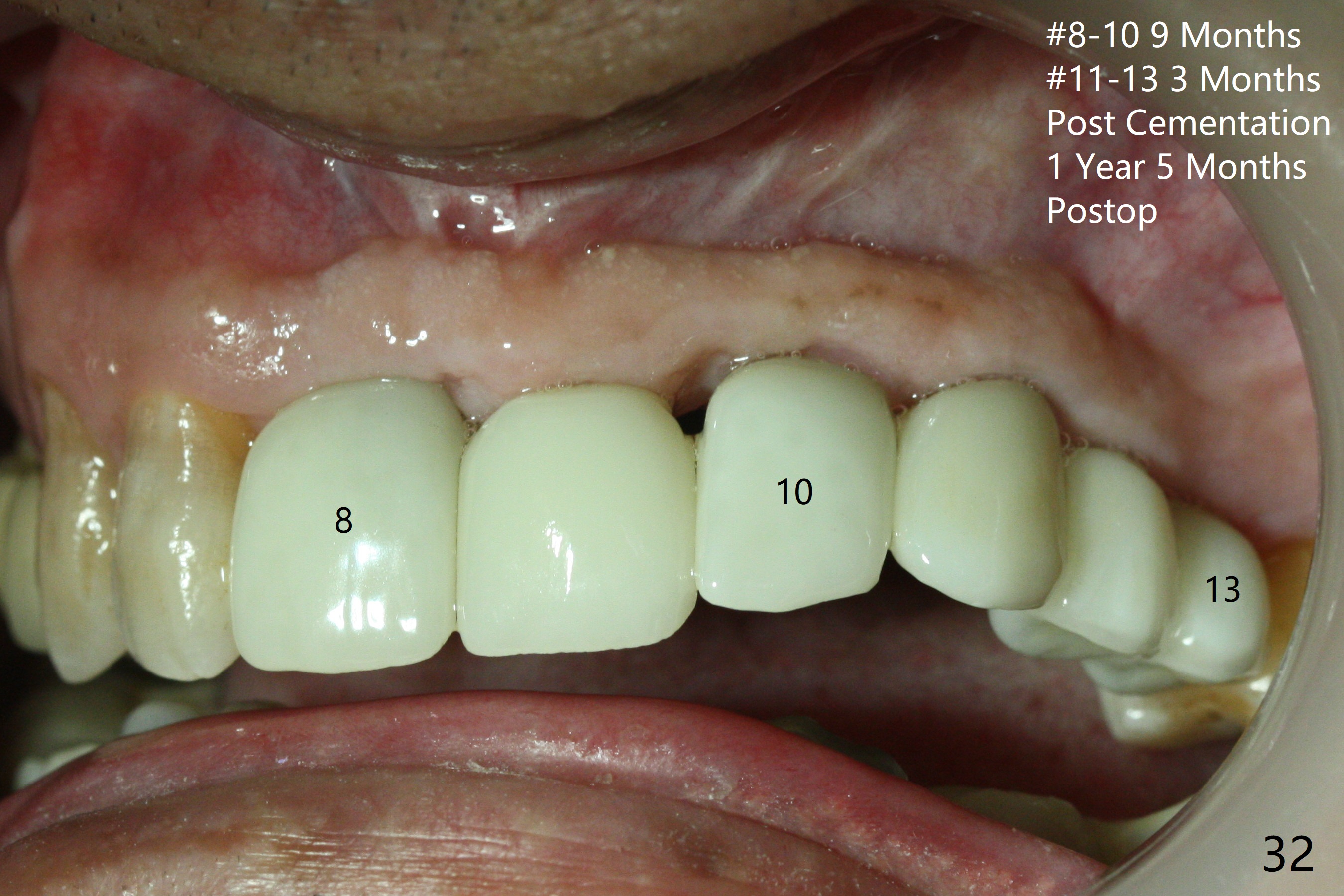Three months later, he returns for follow-up; the soft (Fig.32,33) and hard (Fig.4) tissues remain healthy. There is no metal exposure at #12-13, as compared to 3 months earlier.