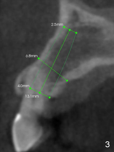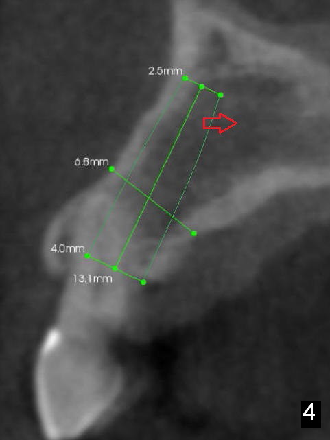 The upper right deciduous canine (Fig.1,2: C) fractures due to caries (Fig.2 *) 1 year after CBCT was taken. Its succedaneus tooth (#6) is distally ectopic. It is reasonably assumed that the bone around the deciduous root is low. In fact the bone density immediately next to the root is 700 U(nits), whereas that in the remaining area is -20 to 200 U (Fig.2). The apical buccal area where the apical end of the implant should be placed (Fig.3) is high again (Fig.2). Due to this special bone density map, the apical end of the implant may be shift palatally (Fig.4 red arrow). Control the trajectory while doing osteotomy and implant placement.