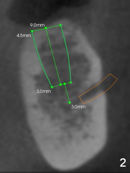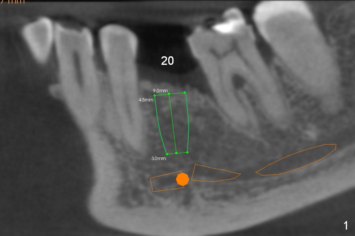 As a part of project converting the lower partial denture into implant-supported restoration, an implant will be placed at #20 (Fig.1,2). Since bone density at the cortex and the medulla is 800 and 200 units, Marking drill will be used to start osteotomy (2 mm in depth) to pass through the cortex, while Magic osteotomes are to be used to extend osteotomy to 9 mm (bone condensation).