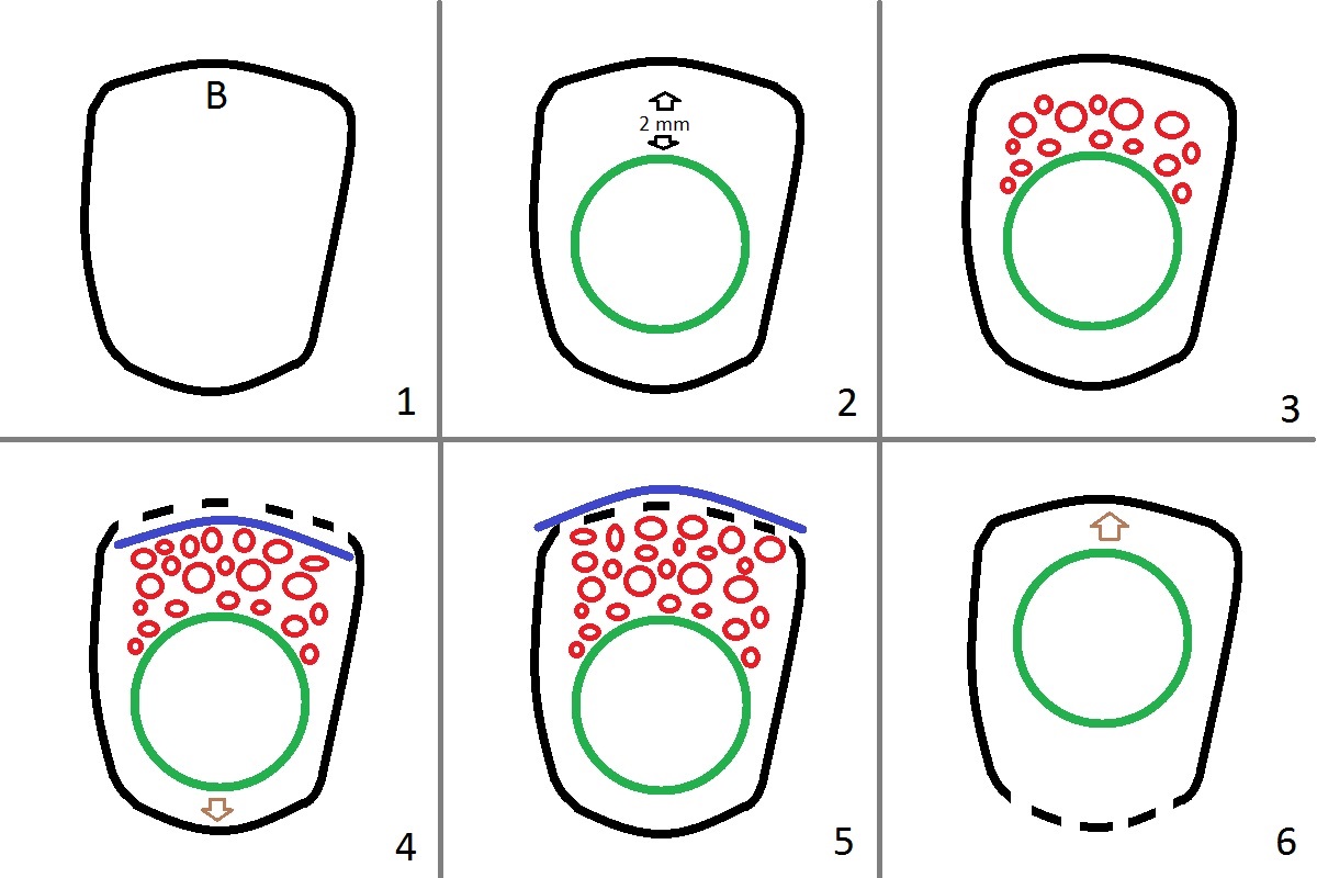 Fig.1 is an occlusal view of an upper molar socket with buccal (B) on the top. When the socket wall is intact, place an implant slightly palatally with 2 mm gap (Fig.2) so that fair amount of bone graft can be placed (Fig.3 red circles). If the buccal plate is defective (Fig.4 dashed line), the implant should be placed further palatal (arrow) so that there is more buccal gap to be filled with bone graft. A piece of collagen membrane is placed either inside the socket for flapless approach, Fig.4 blue curved line) or buccal to the buccal mucoperiosteum (Fig.5, flap approach (incision)). When the palatal wall is defective (Fig.6), the implant should be placed buccally (arrow).