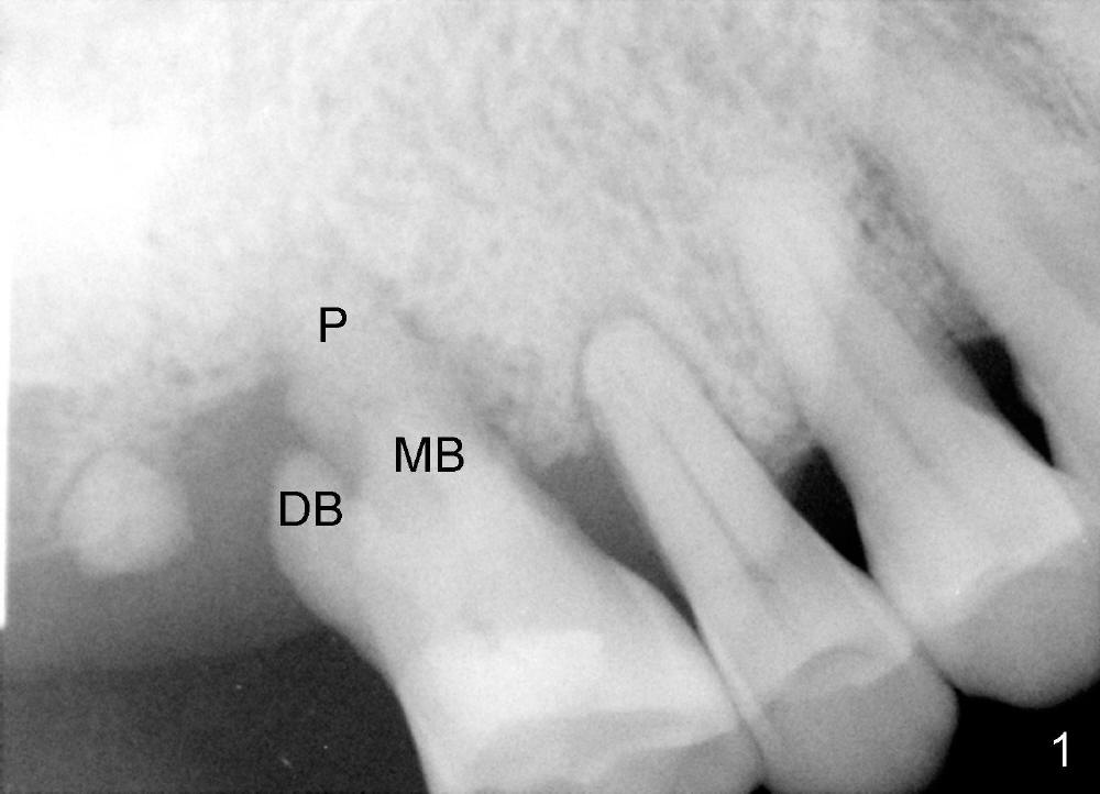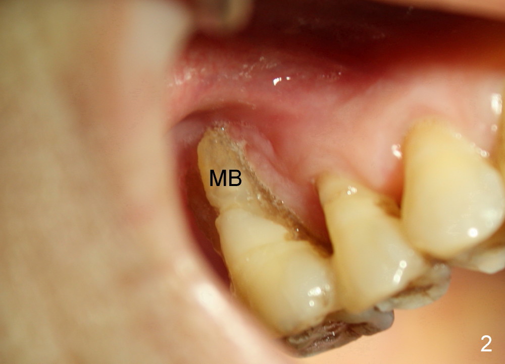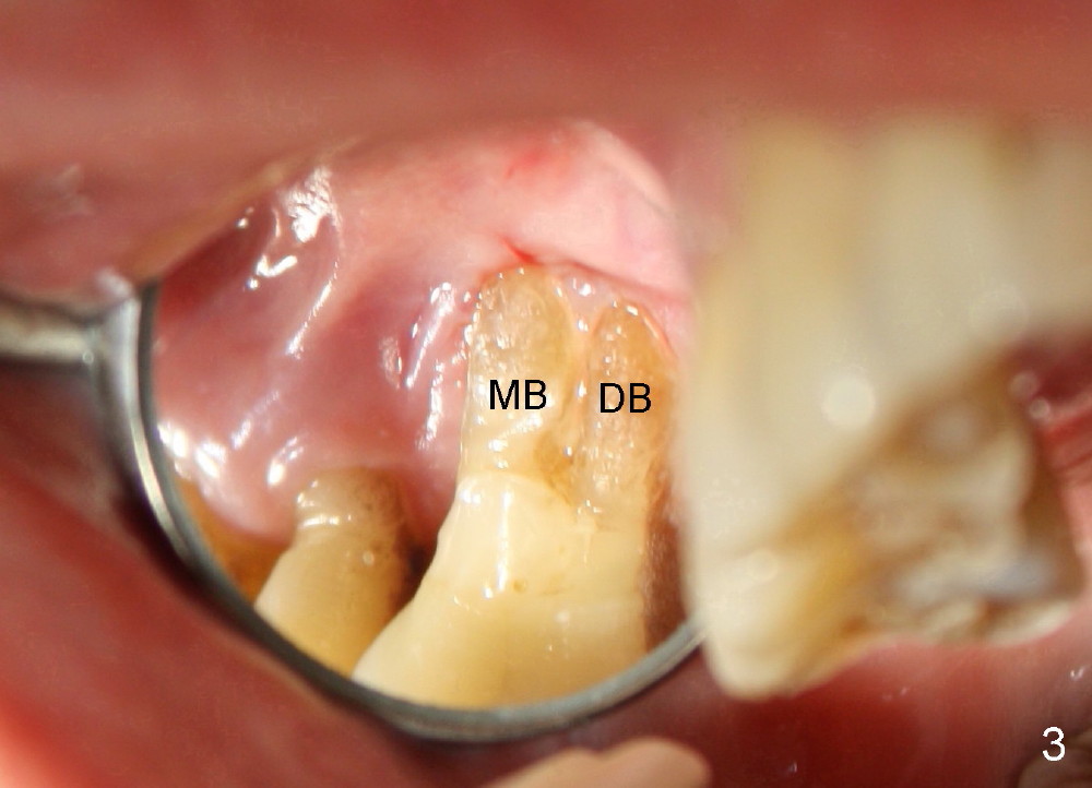 A 68-year-old lady presents to clinic with chief complaint of upper right pain. The tooth #3 has advanced periodontitis, compounded by occlusal trauma (Fig.1). There is severe bone loss, especially around the buccal roots, MB and DB. The latter are exposed (Fig.2,3).