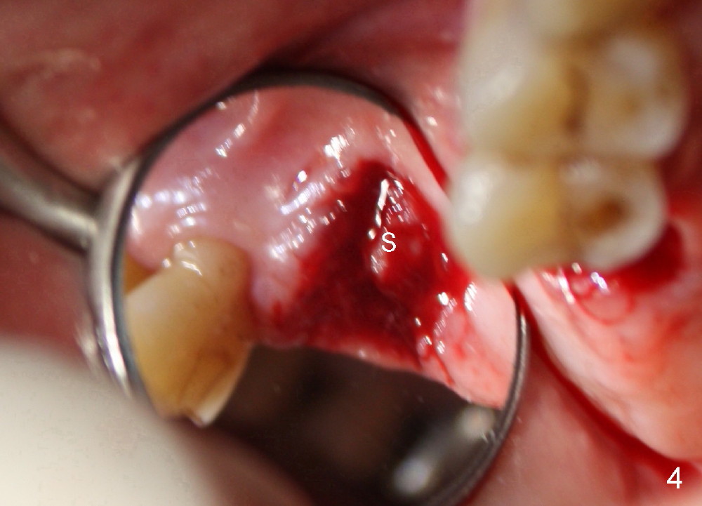 Fig.4 shows the defect post extraction after debridement of infected granulation tissue. Apparently healthy tissue remains undisturbed and attaches to the septum (S).
