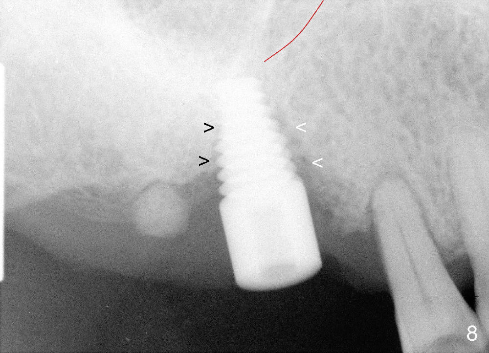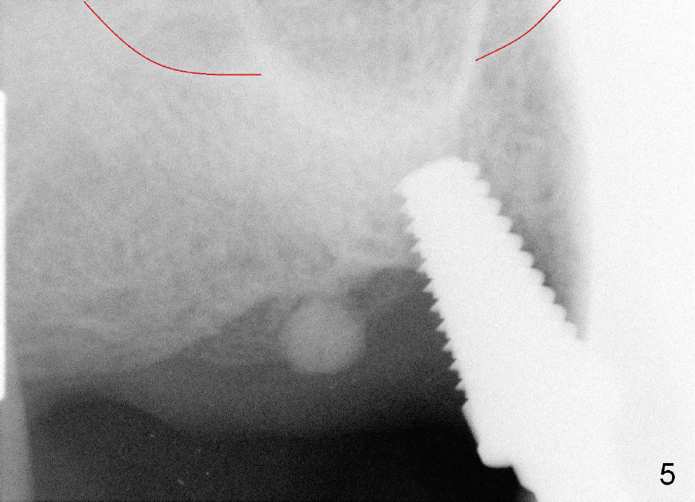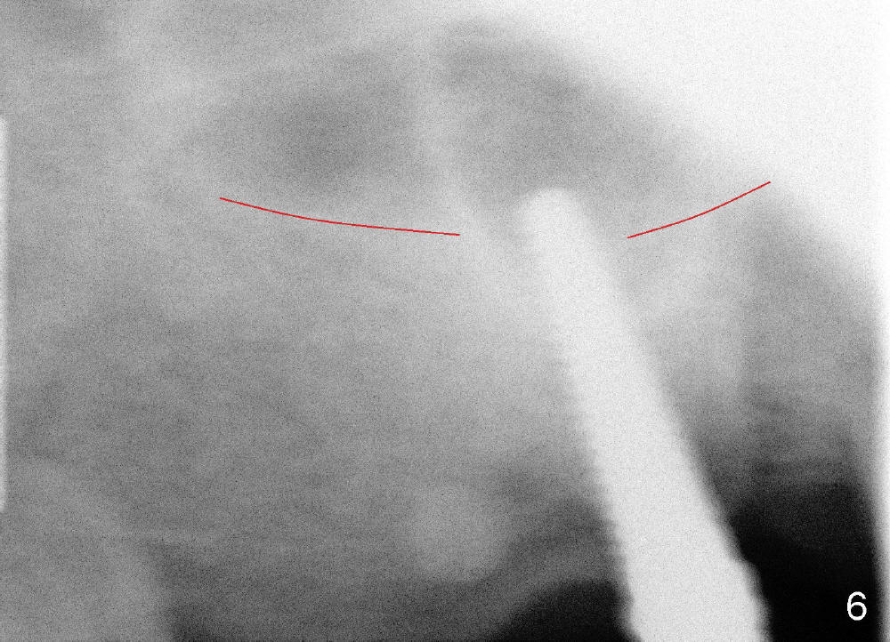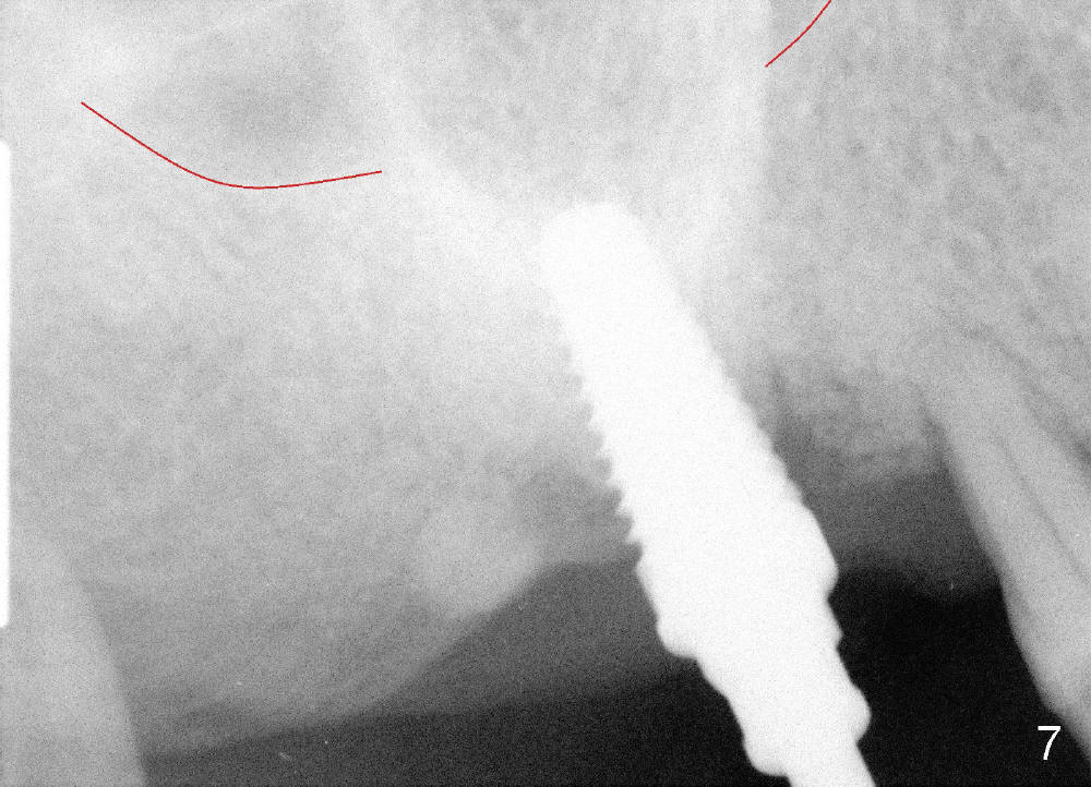 Osteotomy can be done in the palatal socket or the septum in this case to avoid implant thread exposure. Initial osteotomy is created in the palatal socket by using series of tap drills (4.5,5,6,7x17 mm) without stability or enough length (Fig.5; red line: sinus floor). The second osteotomy is made in the septum by using series of tapered osteotomes (2,3,4x17 mm), followed by 4.5x20 mm tap at depth of 17 mm with satisfactory binding (Fig.6). To avoid further sinus penetration and close the socket as much as possible, 5 and 6x17 mm taps are used at 14 mm deep (Fig.7). Nasal blowing reveals air leaking after the last tap. A 6x14 mm tapered implant is placed with insertion torque >60 Ncm (Fig.8). No bone graft is placed. The implant is surrounded by gingiva proximally and lingually and coagulation buccally. The wound is covered by perio dressing.