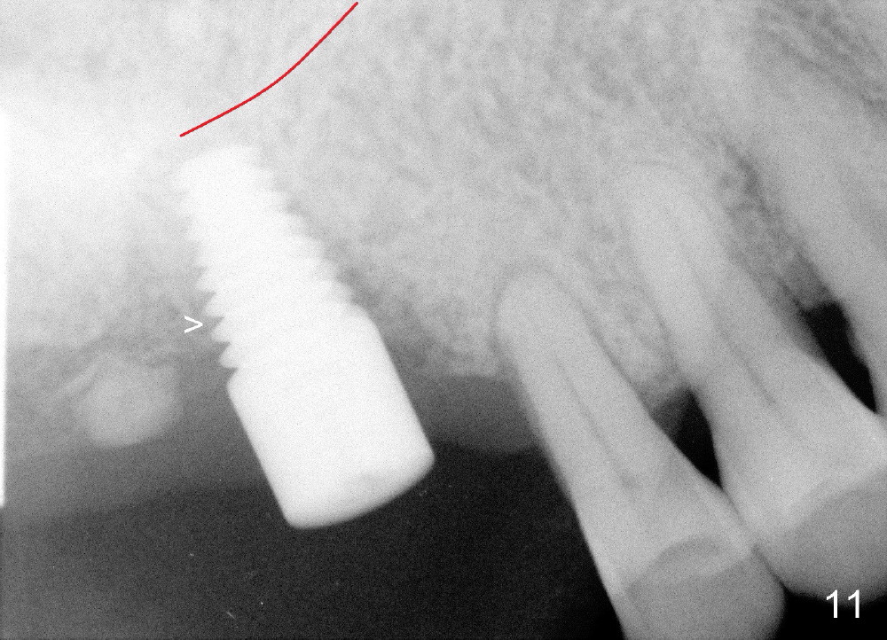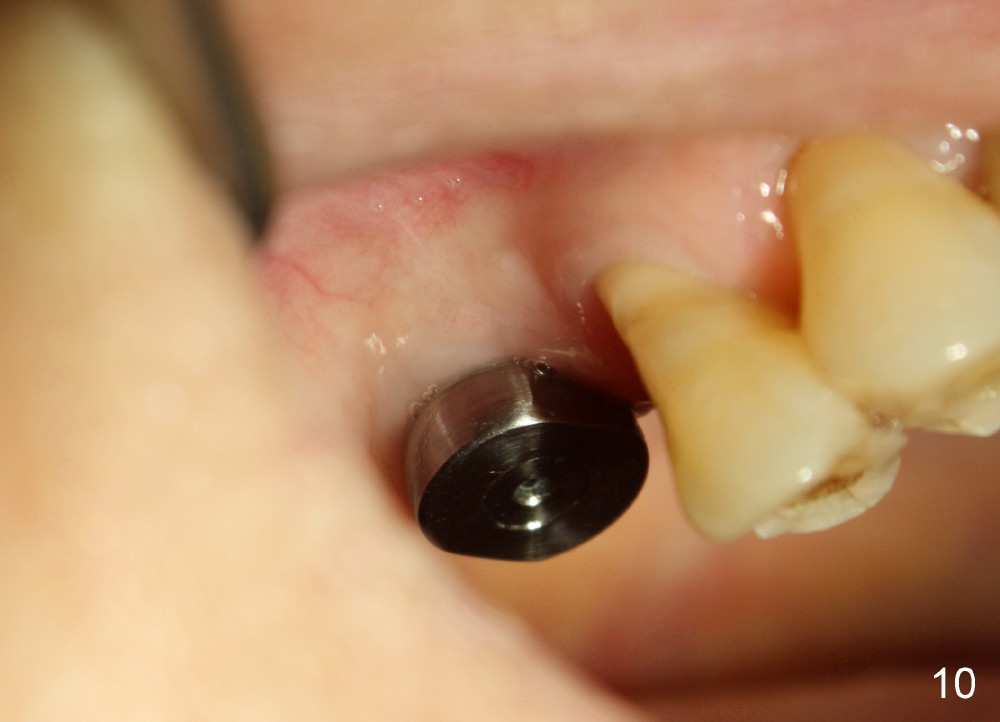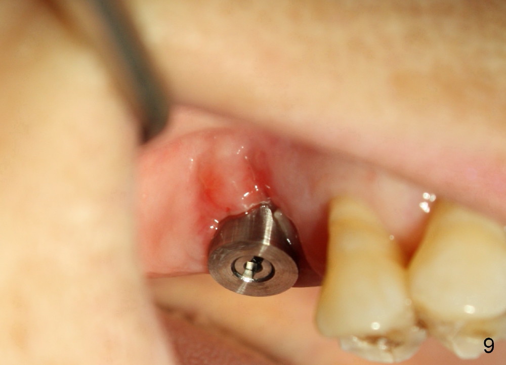 There is no nasal hemorrhage intra or postop. The implant is covered buccally by healing gingiva 7 days postop (Fig.9). It appears that the gingiva has strong regenerative potential. The buccal gingiva looks normal 3 months postop (Fig.10 healing cuff is placed over the implant). The implant appears to have osteointegrated (Fig.11).