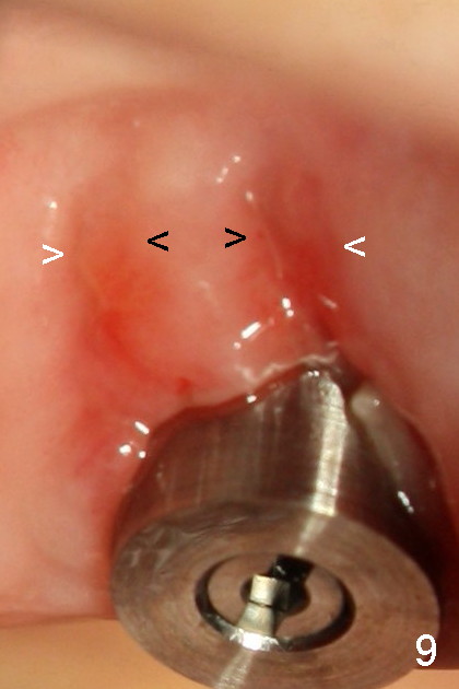 Fig.9 (magnified image, one week post immediate implantation): The mesiobuccal and distobuccal sockets have apparently been healing. The gingiva appears to grow from the septum (black arrowheads) and nearby gingiva (white arrowheads).