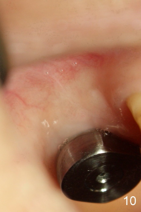 The buccal gingiva looks normal 3 months postop (Fig.10 healing cuff is placed over the implant).