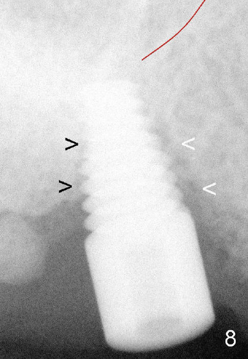 Fig.8: A 6x14 mm tapered implant is placed with insertion torque >60 Ncm. The implant almost obliterates the extraction socket (<) and is close to the sinus floor (red line).