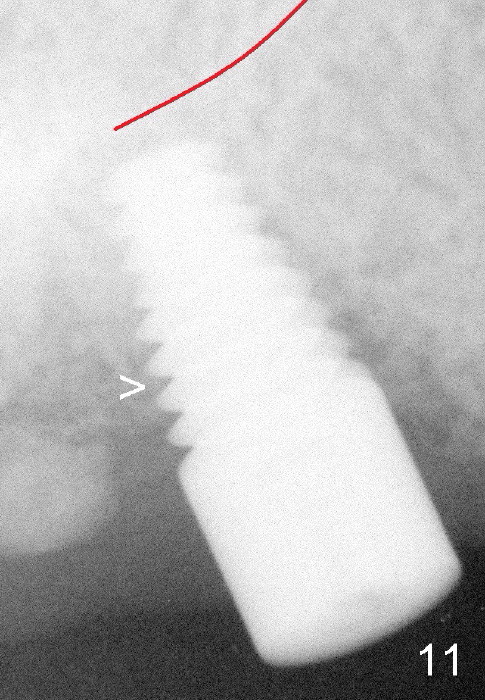 Fig.11: The implant appears to have osteointegrated 3 months postop (>).