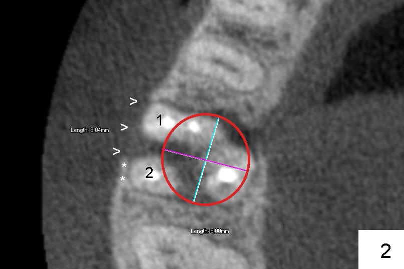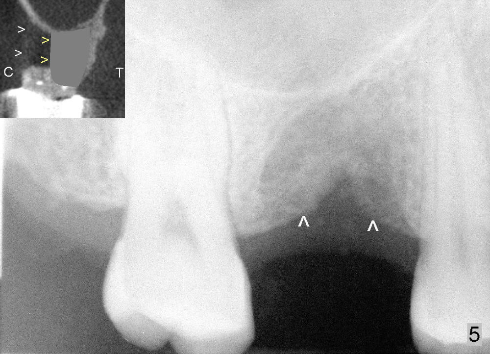 Six months and a half later, the socket appears to be empty (Fig.5) with apparently buccal plate collapse (as indicated by inset in Fig.5). The bony ridge is measured to be ~ 5 mm buccolingually using bone gauge. Osteotomy forms by bone expansion technique. In short, #15 blade is used to split the ridge (slightly lingual), followed by bone scalpels 4,5, and 6 mm, bone blades 4, 5.5 and 7.5 mm, and round tapered osteotomes 2, 3, 4 and 5 mm (Tatum Surgical). The depth is approximately 11 mm. When the last osteotome (4.5 mm round blunt) is used, it deviates too much lingually. A surgical curet is used to explore the osteotomy site. The bony wall appears to be intact except lingual. A 6x11 mm tapered tap is inserted with some resistance (Fig.6). In contrast it is difficult to engage 5.8 mm round tap into the osteotomy site. A 6x11 mm tapered implant is placed with insertion torque 40 Ncm (Fig.7). Amoxicillin is prescribed. The patient is doing fine postop, although the implant is not stable with mild tenderness. Six month post-implantation, the implant appears to have been descended (Fig.8,9, compare to Fig.7).