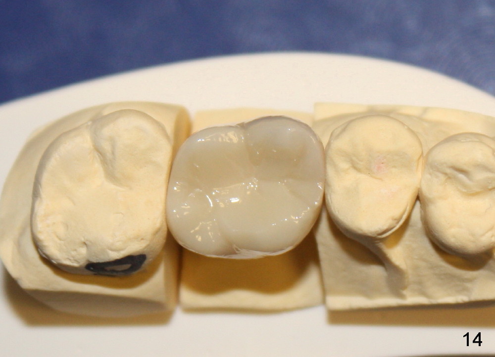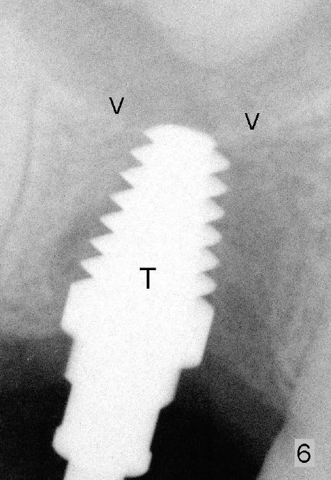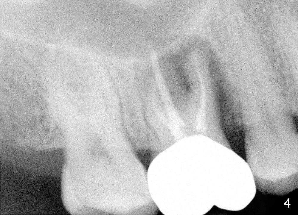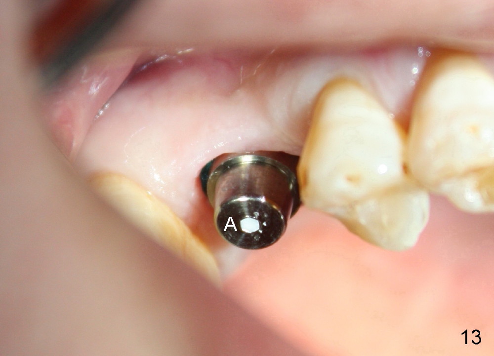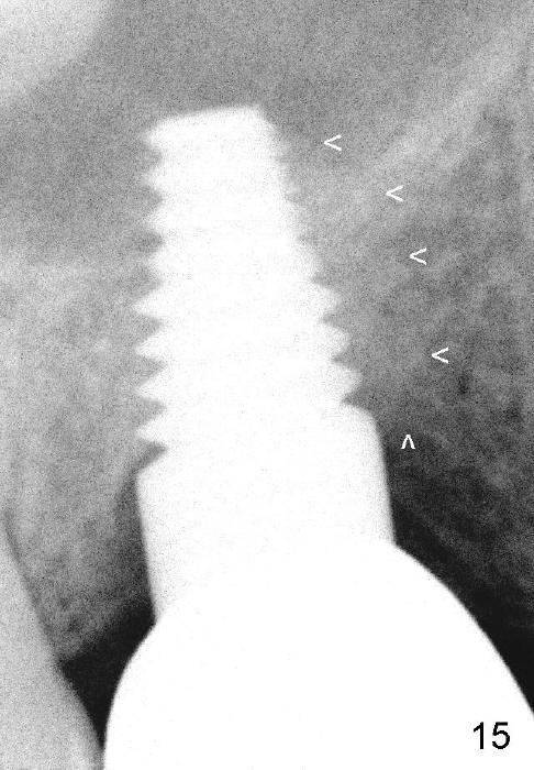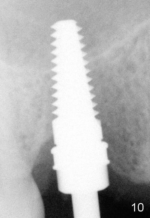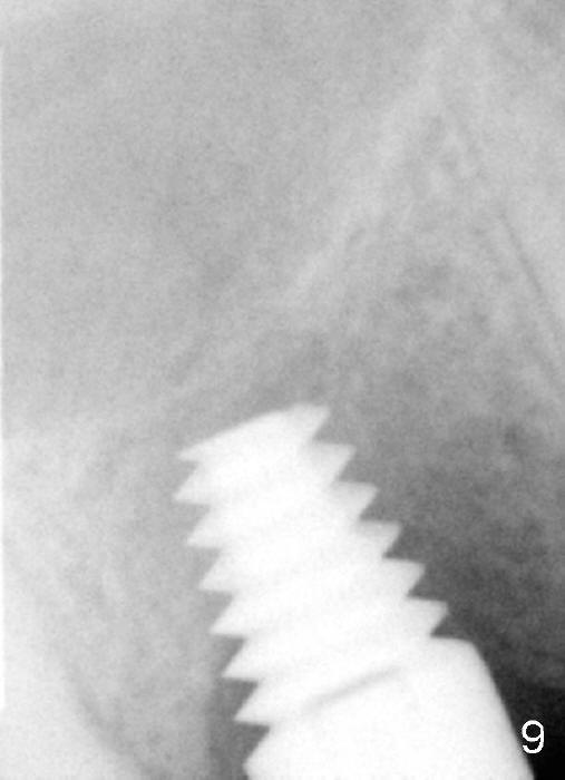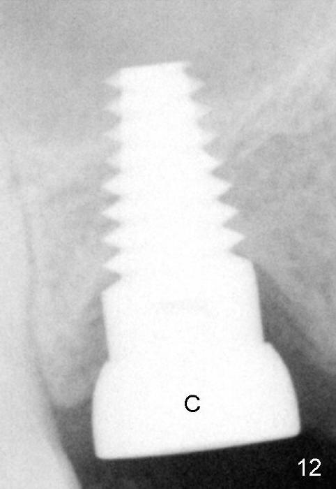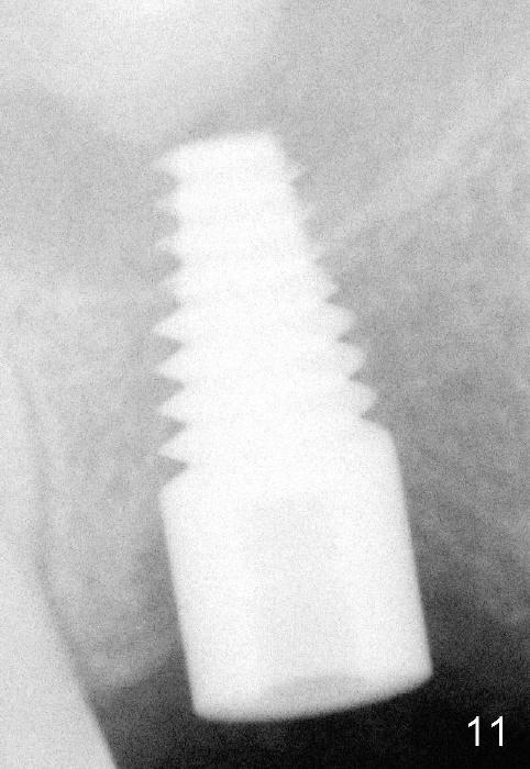 Following local anesthesia, the failing implant is removed without resistance. The sinus floor is present. The lateral walls are intact, although probably short. A series of rounded tapered osteotomes (2-5 mm in diameter) are used for sinus lift at the depth of 14 mm. A 4.5x14 mm tap is inserted (Fig.10). One more carpule of Lidocaine is administered. A 6x14 mm implant is placed with torque more than 60 Ncm without additional bone graft (Fig.11). A 6-month postop PA confirms osteointegration (Fig.12). An abutment is placed (Fig.13) for a definitive crown (Fig.14). PA taken 6 months post cementation shows that bone density mesial to the implant increases (Fig.15 <).