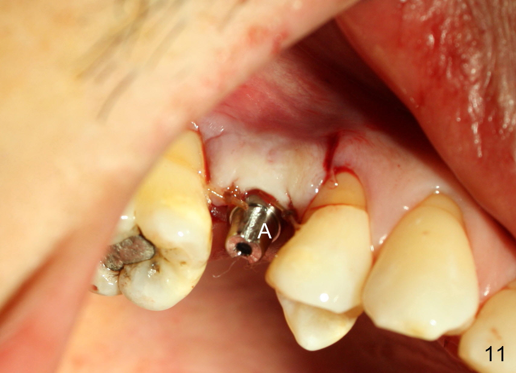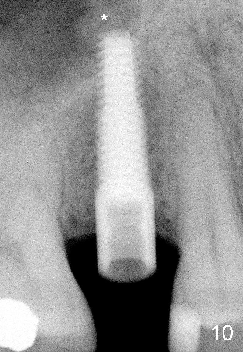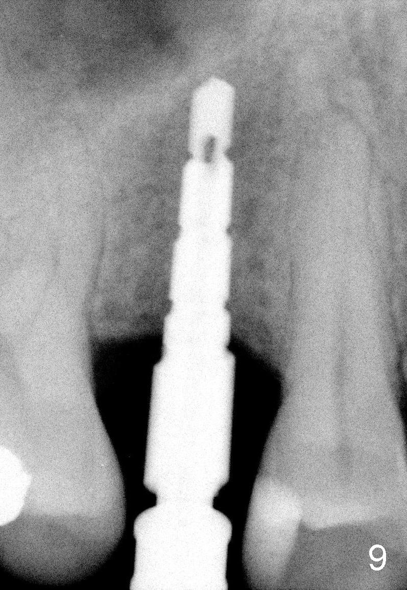 Nine months later, the patient returned for re-implantation (Fig.7). Amoxicillin and Chlorhexidine were used preop and postop. Flaps were raised for better vision of reimplantation site (Fig.8). Bone density was high (type II). Drills were used to form osteotomy (Fig.9). A 4x17 mm implant was placed with internal sinus lift (Fig.10*). The insertion torque was also >60 Ncm. The flaps were approximated and a short abutment (Fig.11 A) was placed to hold perio dressing in place.