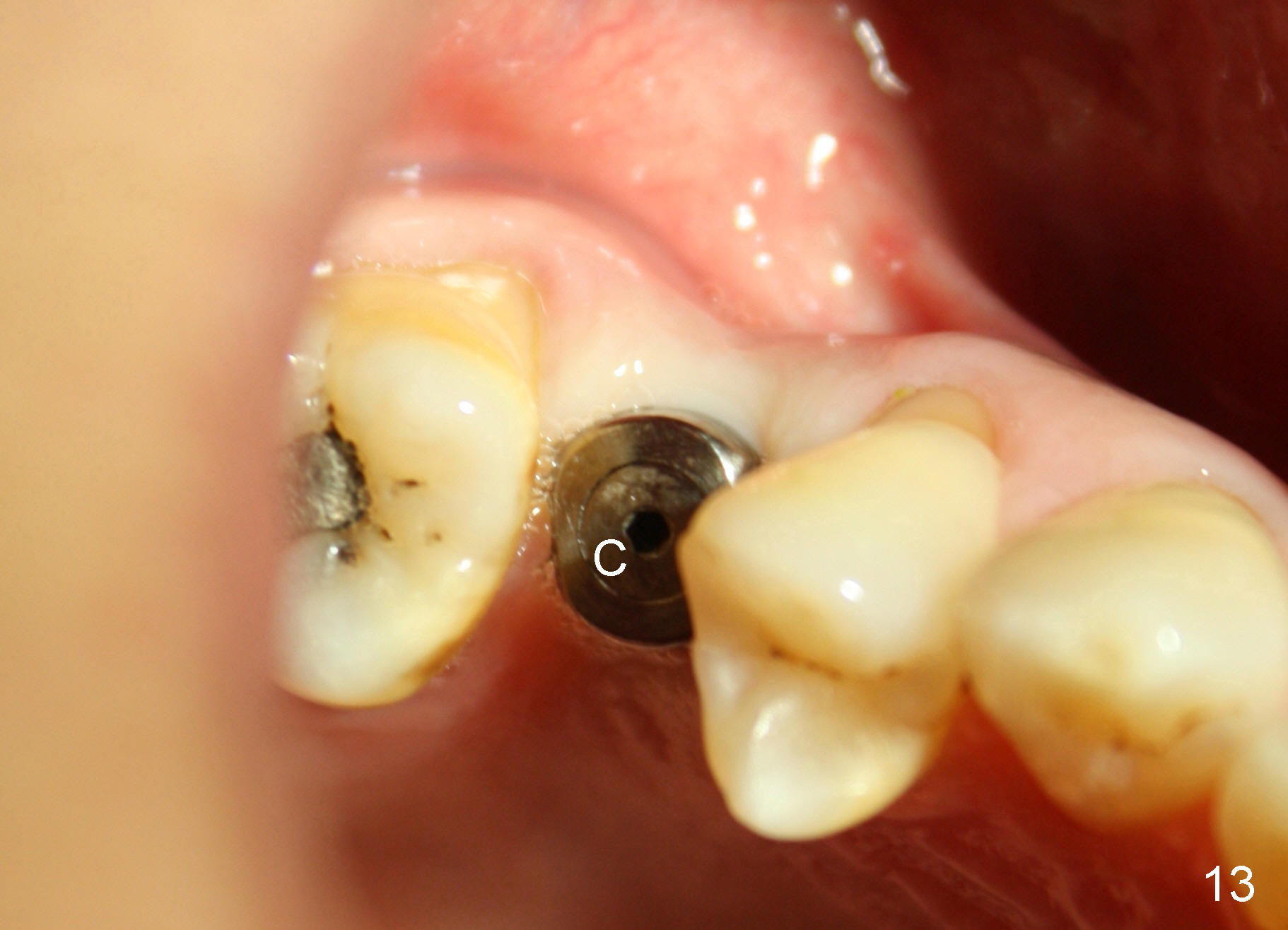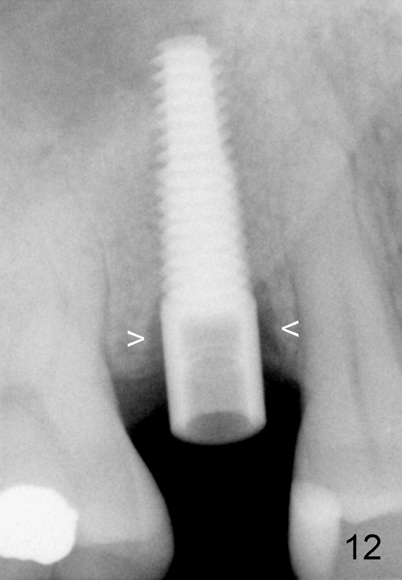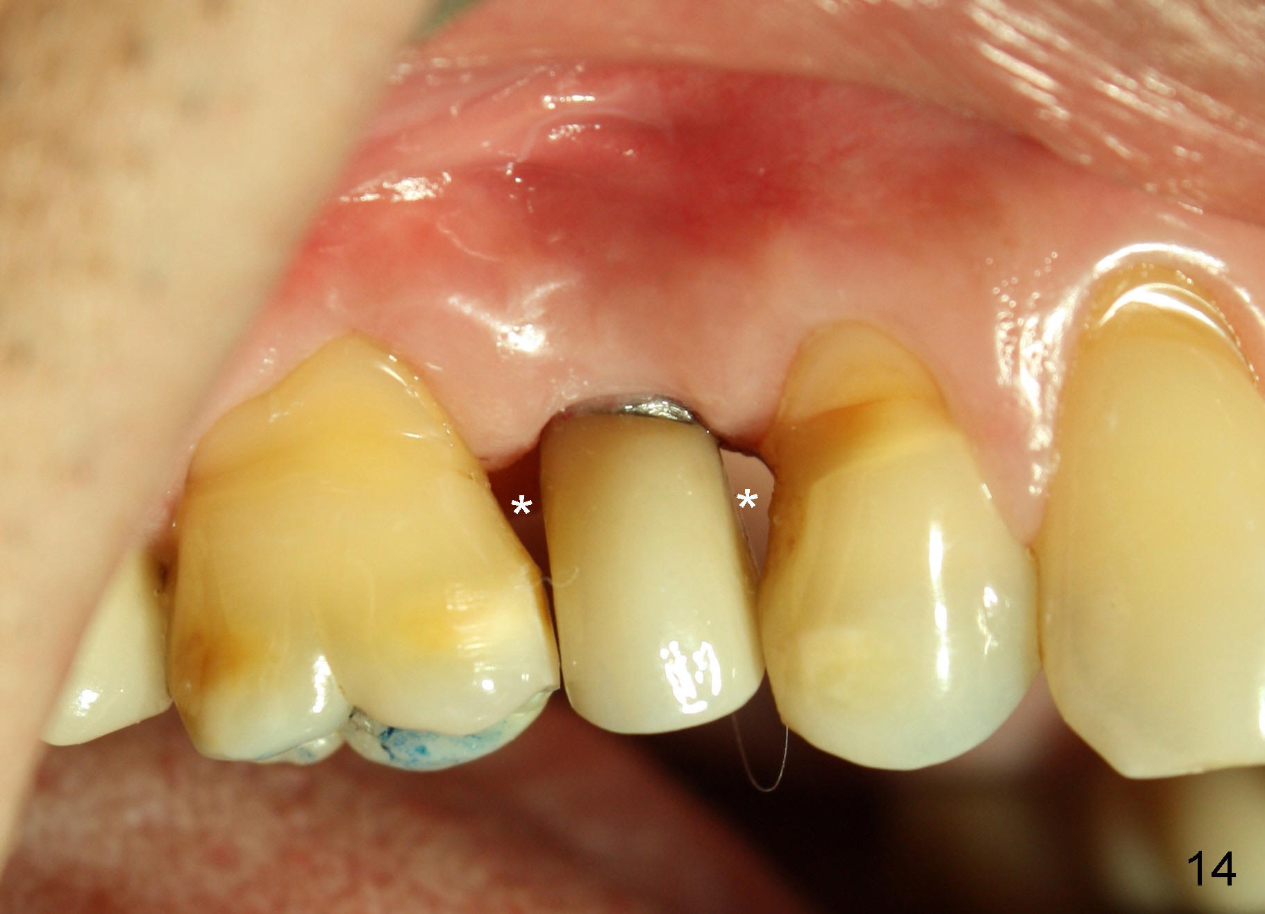 X-ray at 2.5 months postop shows crestal bone loss (Fig.12 *), although the implant is stable without inflammation (Fig.13 C: healing cuff). When the crown is bonded 3.5 months postop, there is no papilla (Fig.14 *).