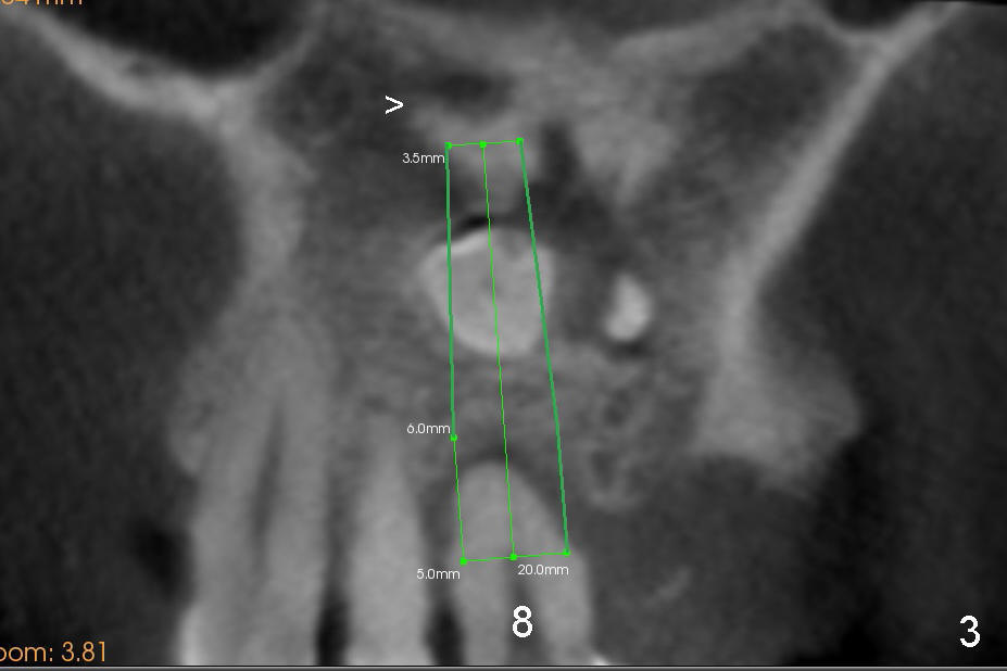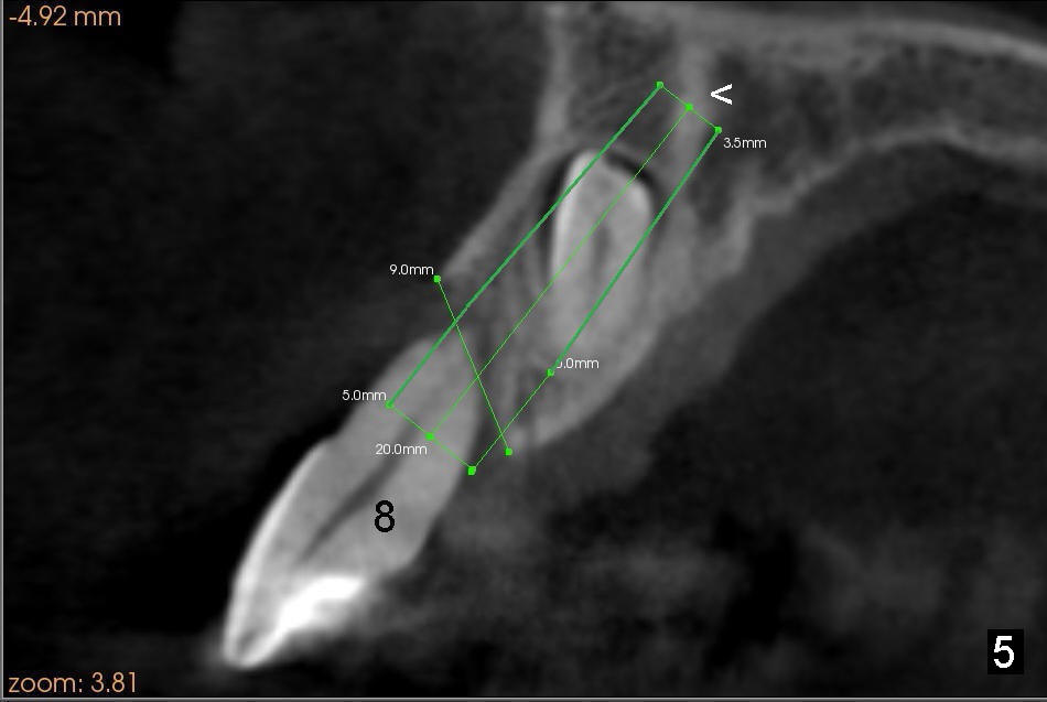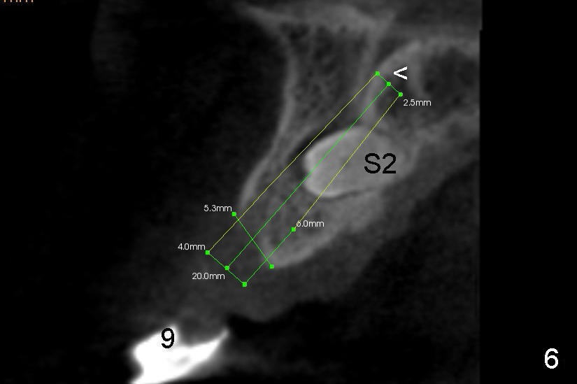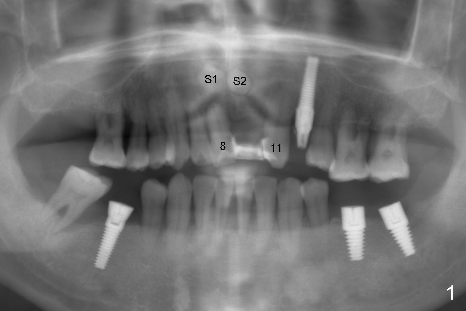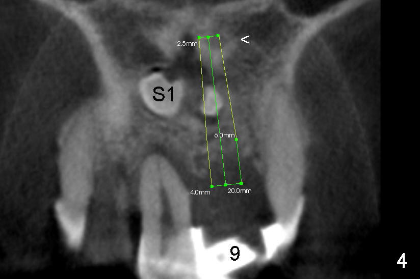 Treatment plan is to extract two supernumerary teeth (S1,S2) and #8, bone graft (mainly S1,2 sockets, and #8 buccal for cosmetics) and place immediate implants at the sites of #8 and 9. Long implants (20 mm) are to be used to engage into the two bone segments, coronal and apical to the S1,2 sockets (Fig.5,6). Since the bone segment apical S1,2 sockets is mainly cortical (arrowheads in Fig.3-6; lamina dura and nasopalatine canal), the two implants are expected to be stable. A palatal incision is going to be made to expose S1,2, as one of them (S2) is more or less palatal (Fig.6). Here is surgery.