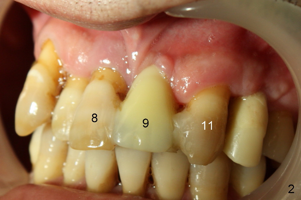 A 41-year-old man has poor dentition (Fig.1: #12 immediate provisional). It appears that #10 is congenitally missing. A temporary bridge is fabricated (Fig.1: #8-11) when #9 is reportedly extracted. Recently bonding between #9 pontic and #11 detaches. The bridge is loose (Fig.2). The tooth #8 is periodontally compromised (Fig.3,5: CT sagittal and coronal sections, respectively).