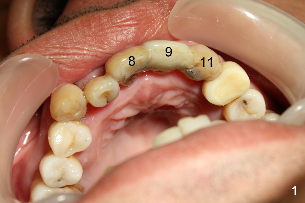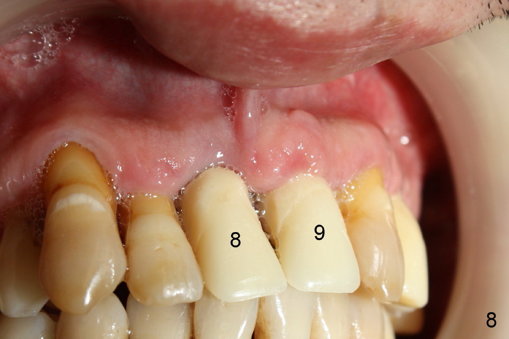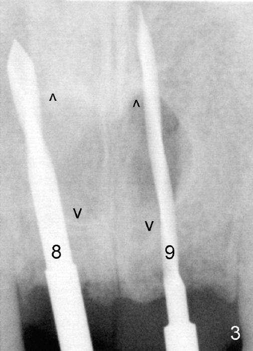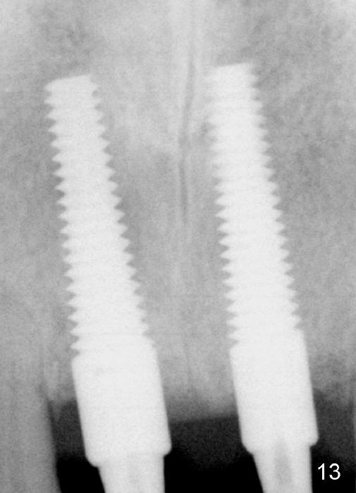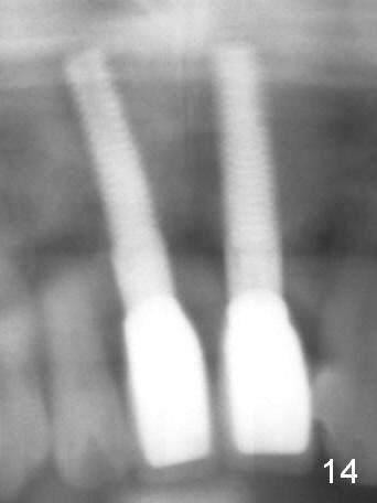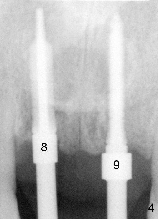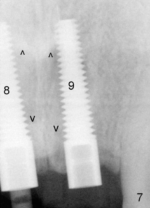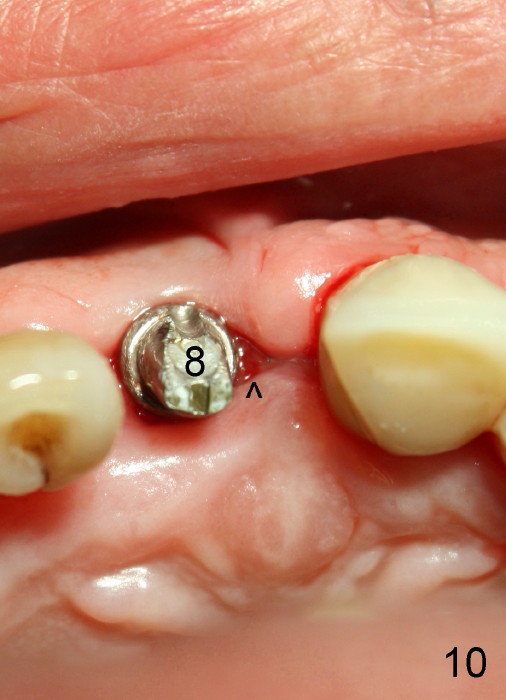 The insertion torque for the implants (4.5x20 mm and 4x20 mm) are 40 and 60 Ncm for #8 and 9, respectively (Fig.7). The stability is probably due to the fact that these two implants are engaged into the two cortical plates of the sockets (arrowheads). Allograft is placed in the mesiodens sockets. Immediate provisionals are fabricated. Fig.8,9 show the provisionals 18 days postop. One of the provisionals (#8) is dislodged 5 weeks postop. Before recementation of the provisional (Fig.10), healthy granulation tissue is found next to the implant (^).