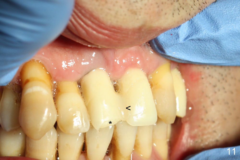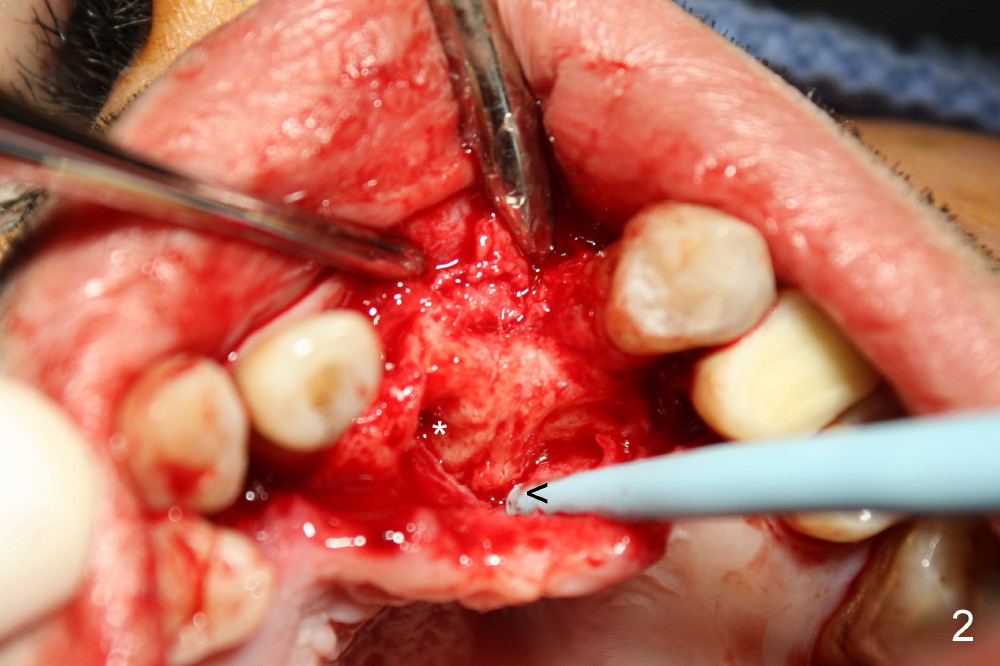 CBCT shows that the two mesiodens, esp. left one, are close to the palatal plate. After removal of the peridontally compromised tooth #8 and the pontic #9 (as compared to Fig.1), the palatal flap is raised to expose the left mesiodens (Fig.2 <; *: incisal foramen).