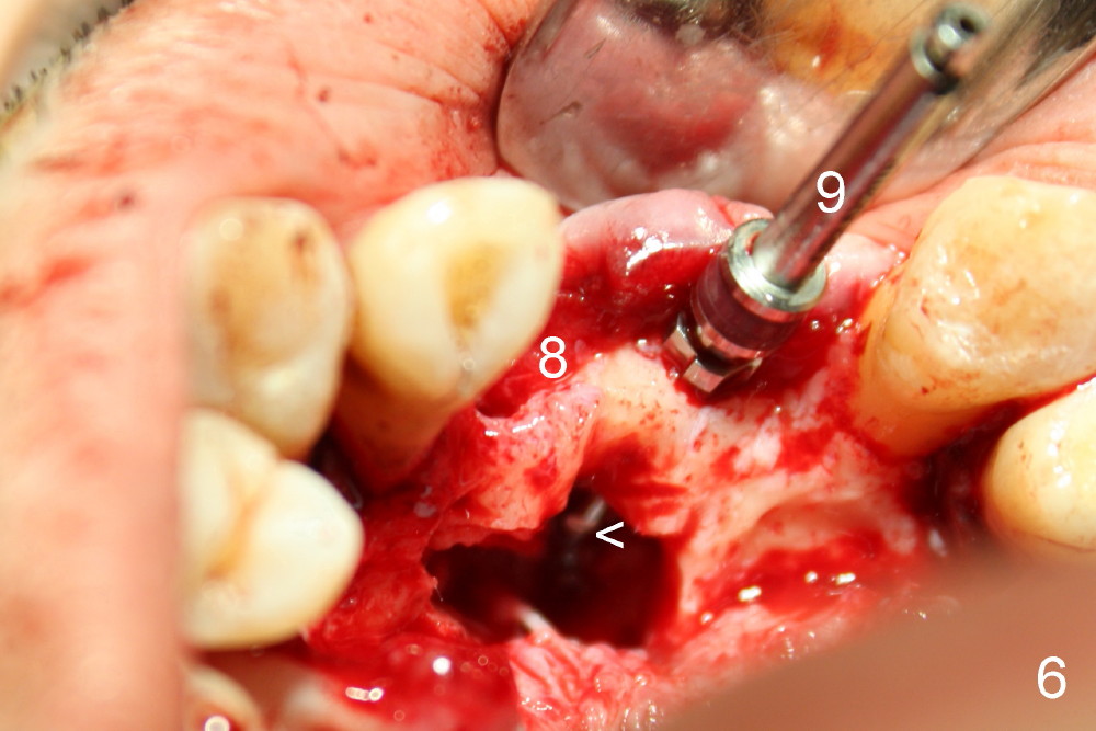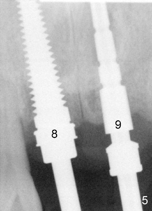 Trajectory is being corrected while osteotomy is increasing with reamers (Fig.4: 3 and 2.5 mm). When a 4.5x20 mm tap is inserted at the site of #8 (Fig.5), it is stable. A 3.5x20 mm tapered drill is at the site of #9 for parallelism. When the tap is removed from the osteotomy of #8, the middle portion of the 3.5x20 mm drill at the site of #9 is seen to pass the socket of the left mesiodens (Fig.6: <).