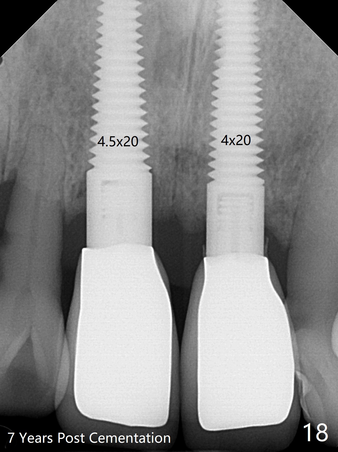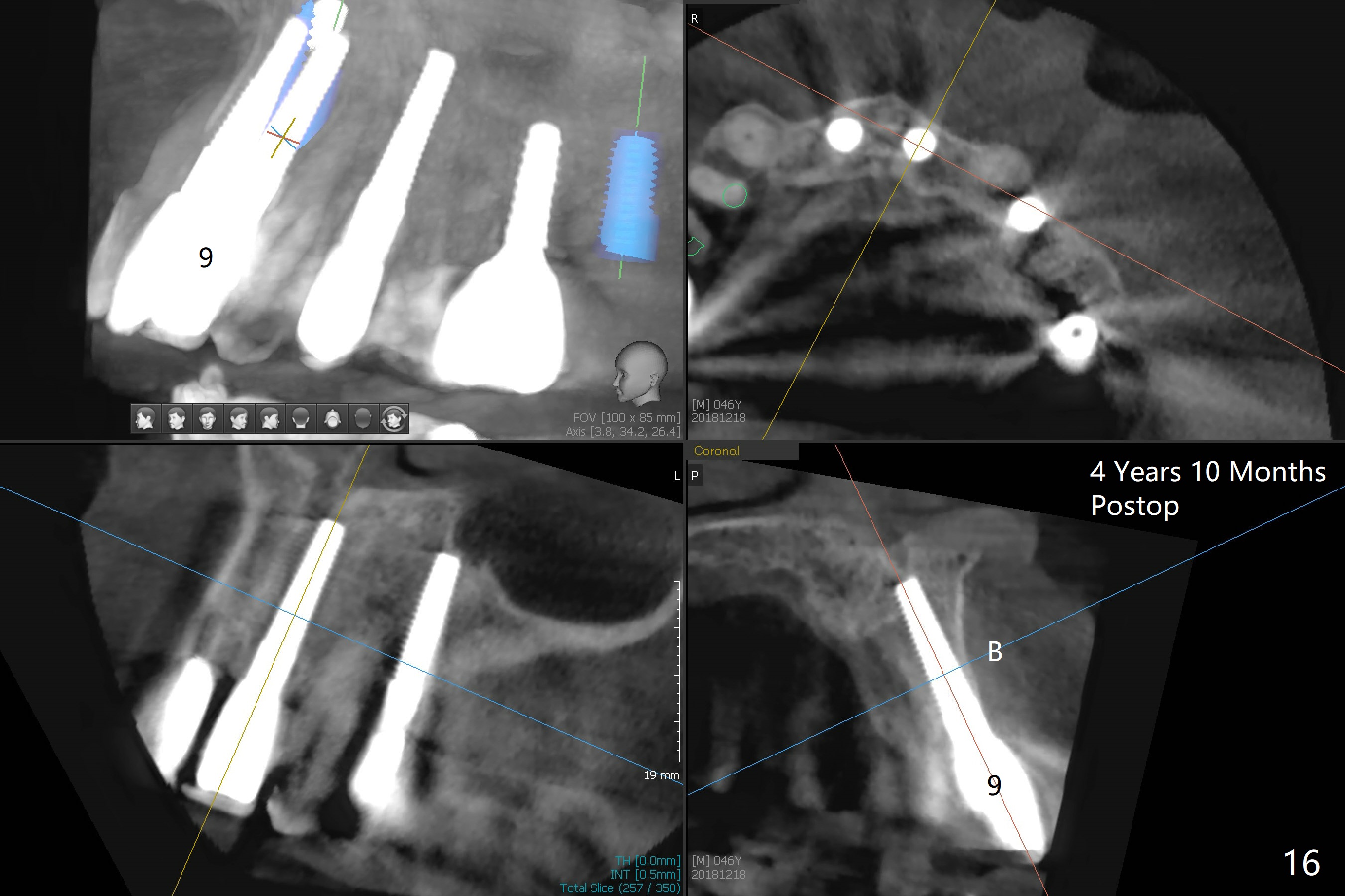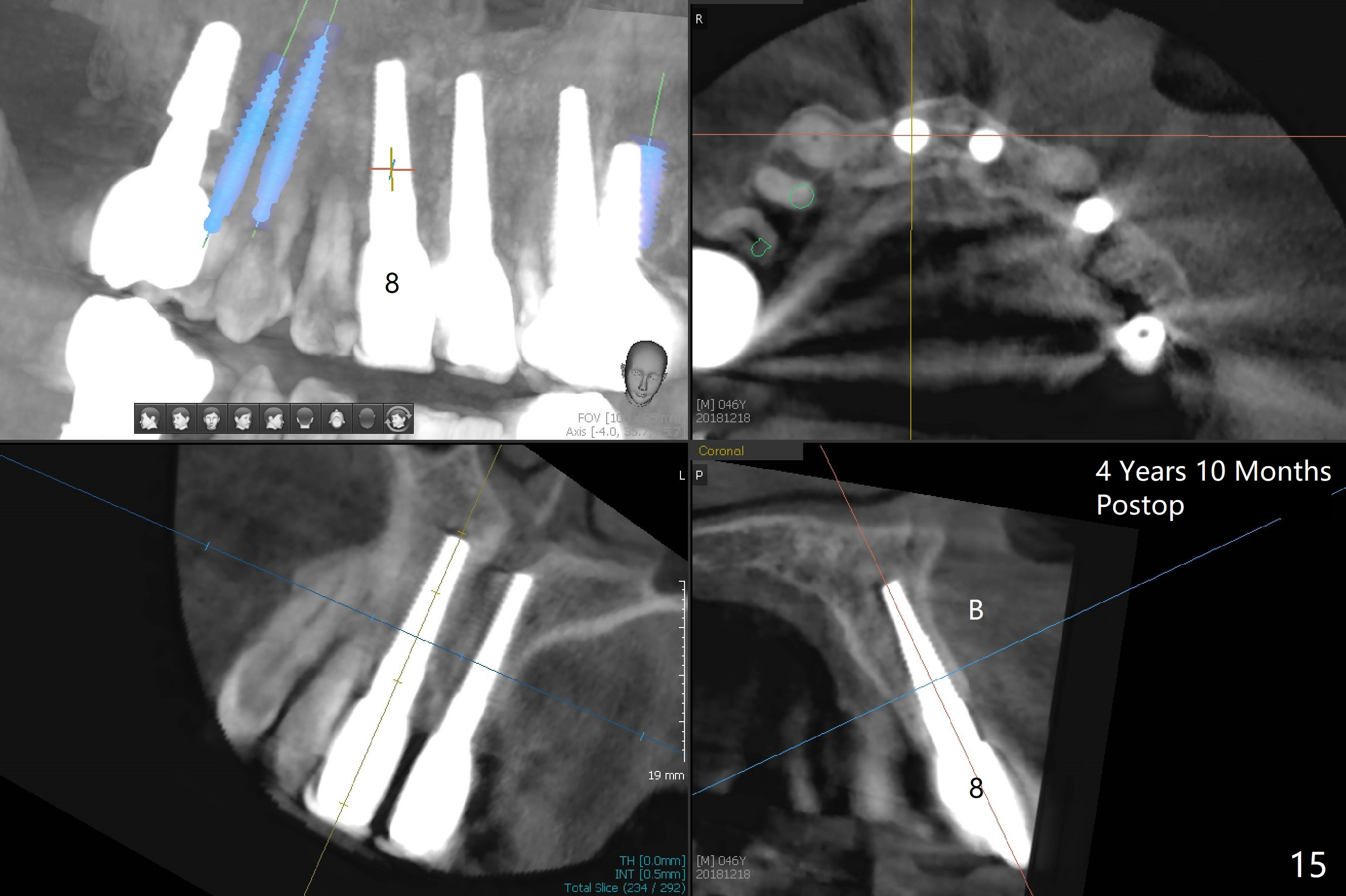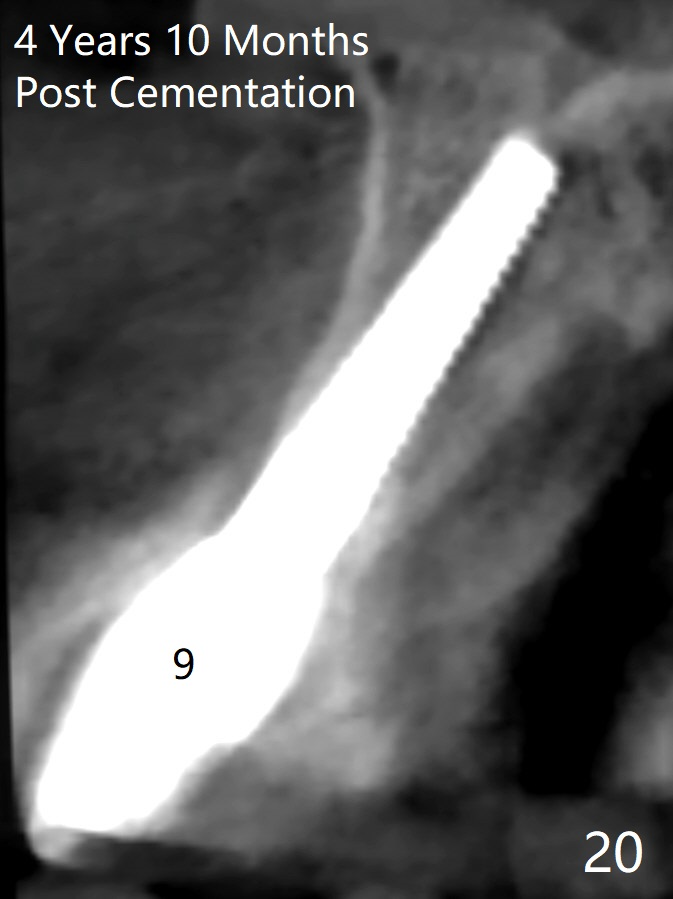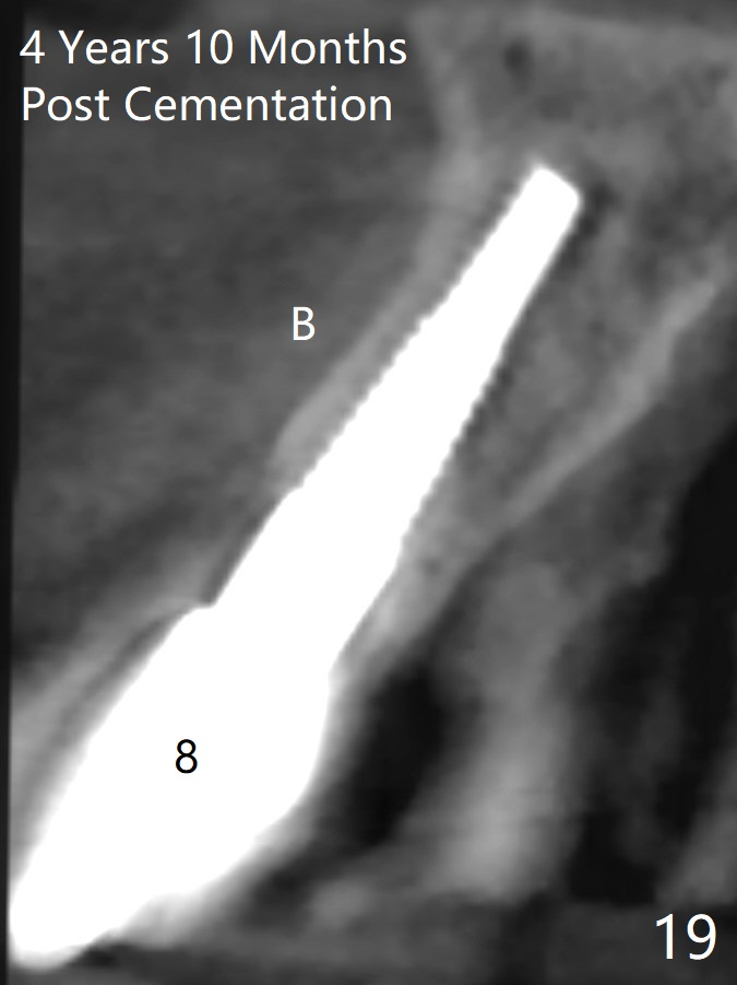 These two anterior implants remain stable 2 months 20 days postop, since one of the immediate provisionals has incisal chip (Fig.11 *) while both of them are splinted (<) to increase retention. There is no complain about paresthesia around the incisal papilla due to separation of the nasopalatine nerve. Mesiodens sockets disappear 7 months postop (Fig.13). There is no bone loss 2 years 9 months postop (Fig.14 panoramus) or 4 years 10 months postop (Fig.15,16 CT). The buccal gingiva is reddish and swollen with bleed on probing and history of pain 7 years post cementation (Fig.17). There is no bone loss in PA (Fig.18). The buccal plate at #9 is thinner than that at #8 4 years 10 months post cementation (Fig.19,20).