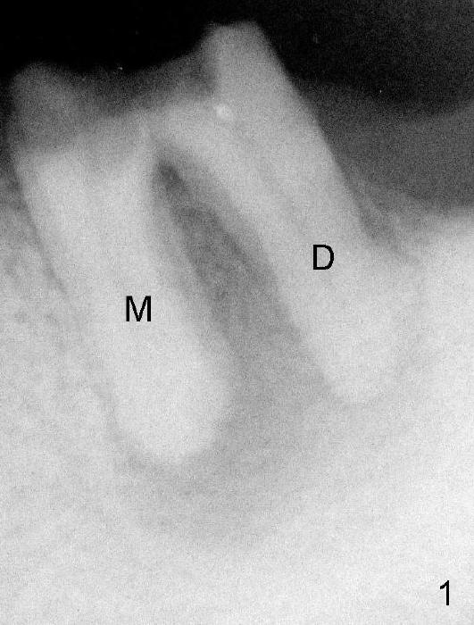 Preop PA shows extensive bone loss around the residual roots (Fig.1). M: mesial; D: distal.
