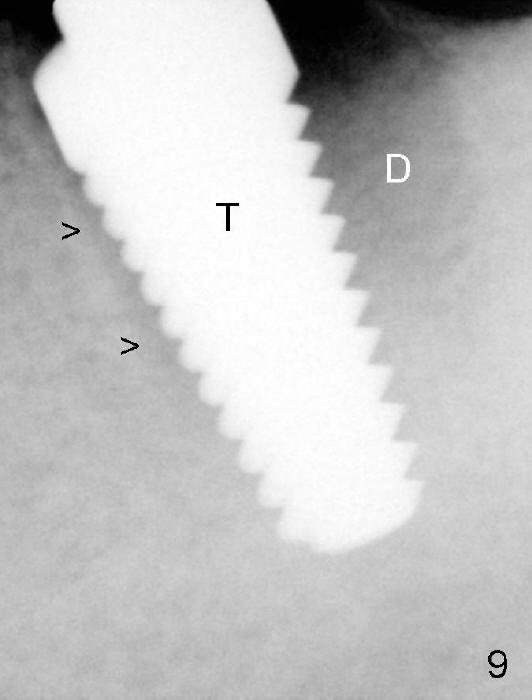 Intraop PA: 7x17 mm tap (T) is placed mainly in the mesial socket, which is obliterated (>).
