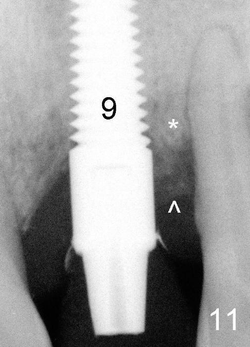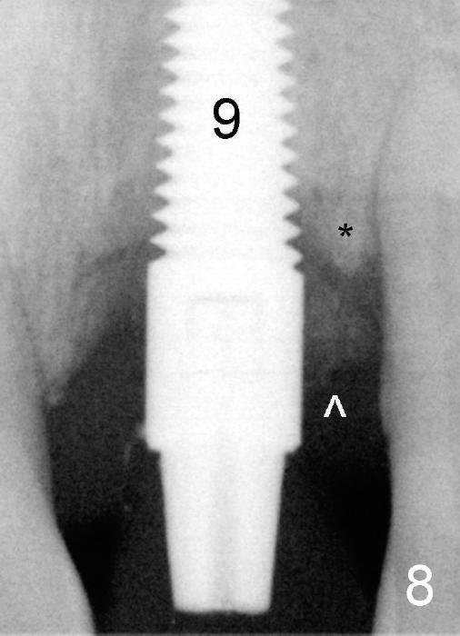 Fig.11: Six months postop. The crest bone (*) and the bone graft (^) appear to have been fused.