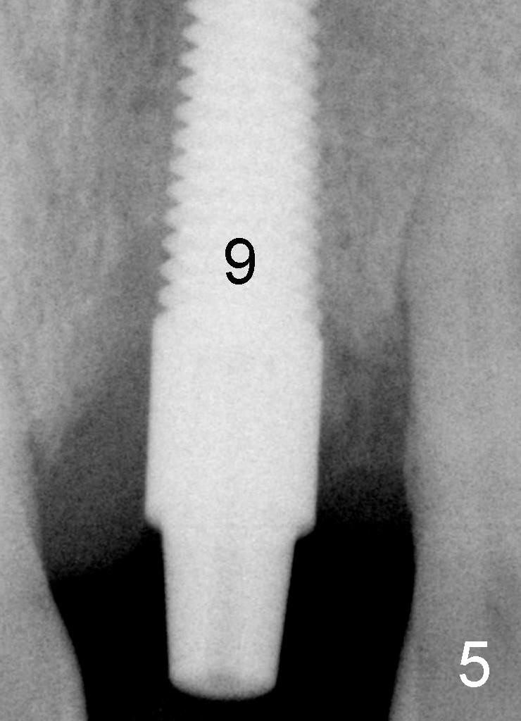 Fig.5 (magnified): Immediately post-implantation: #9: 5x20 mm. Autogenous bone graft from osteotomy (reamers) is to be placed around the implant.
