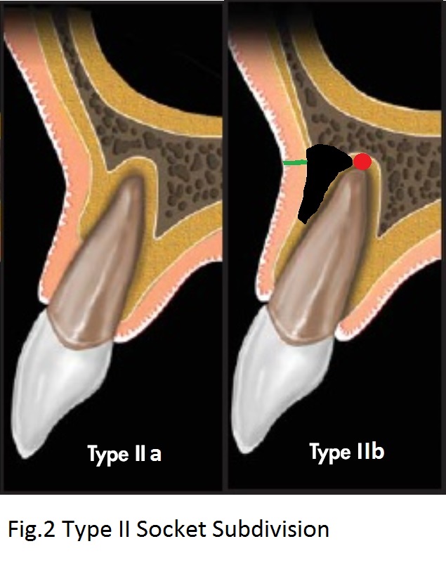 The typical Type II Socket (with loss of the coronal portion of the buccal plate) proposed by Elian et al is often observed in periodontitis patients (Type IIa, Fig.2), whereas the apical portion of the buccal plate is resorbed (Type IIb black area) in association with endodontic lesion (red circle) with or without apical fistula (green).