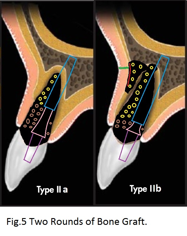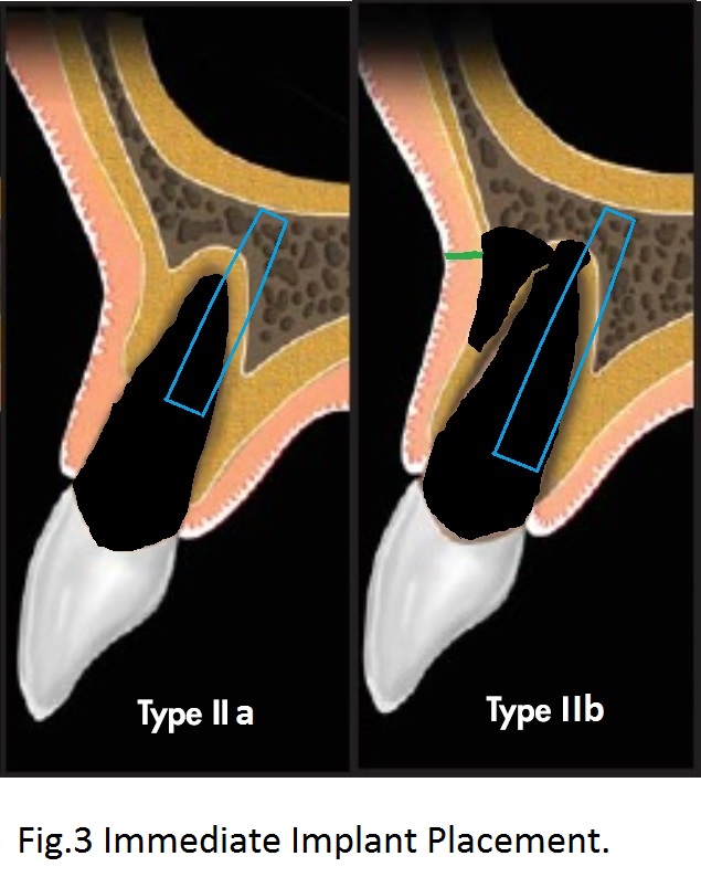 To reduce periimplantitis, the immediate implant (Fig.3 blue) should be placed placed as low as possible (subcrestal). If the coronal loss of bone of Type IIa is severe, the implant could be slightly supracrestal.