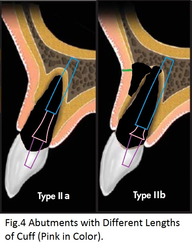 To compensate for deep placement of the immediate placement, an abutment (Fig.4 purple) with long cuff (pink) is placed for Type IIa socket.