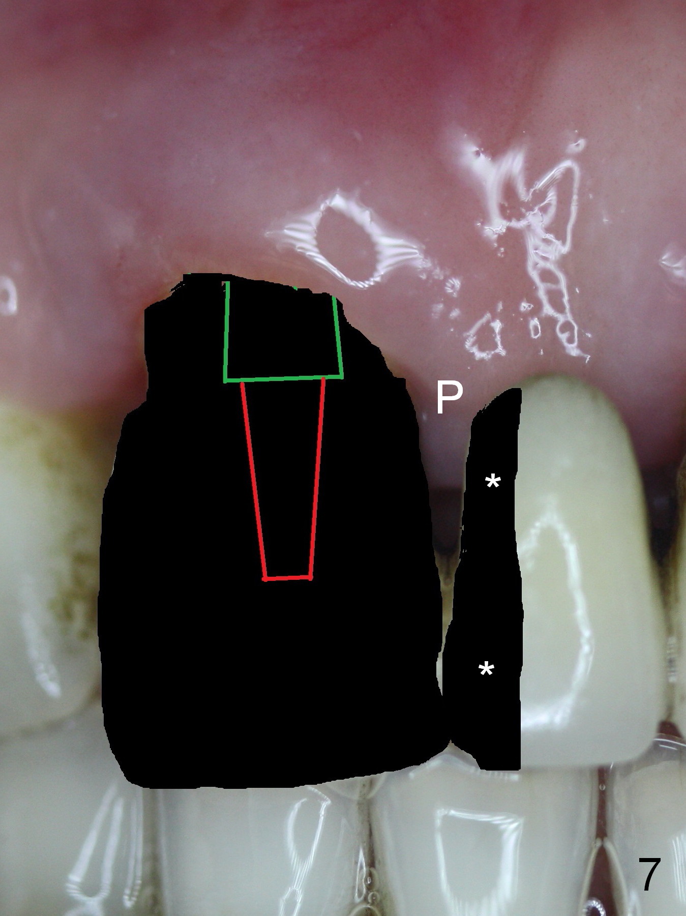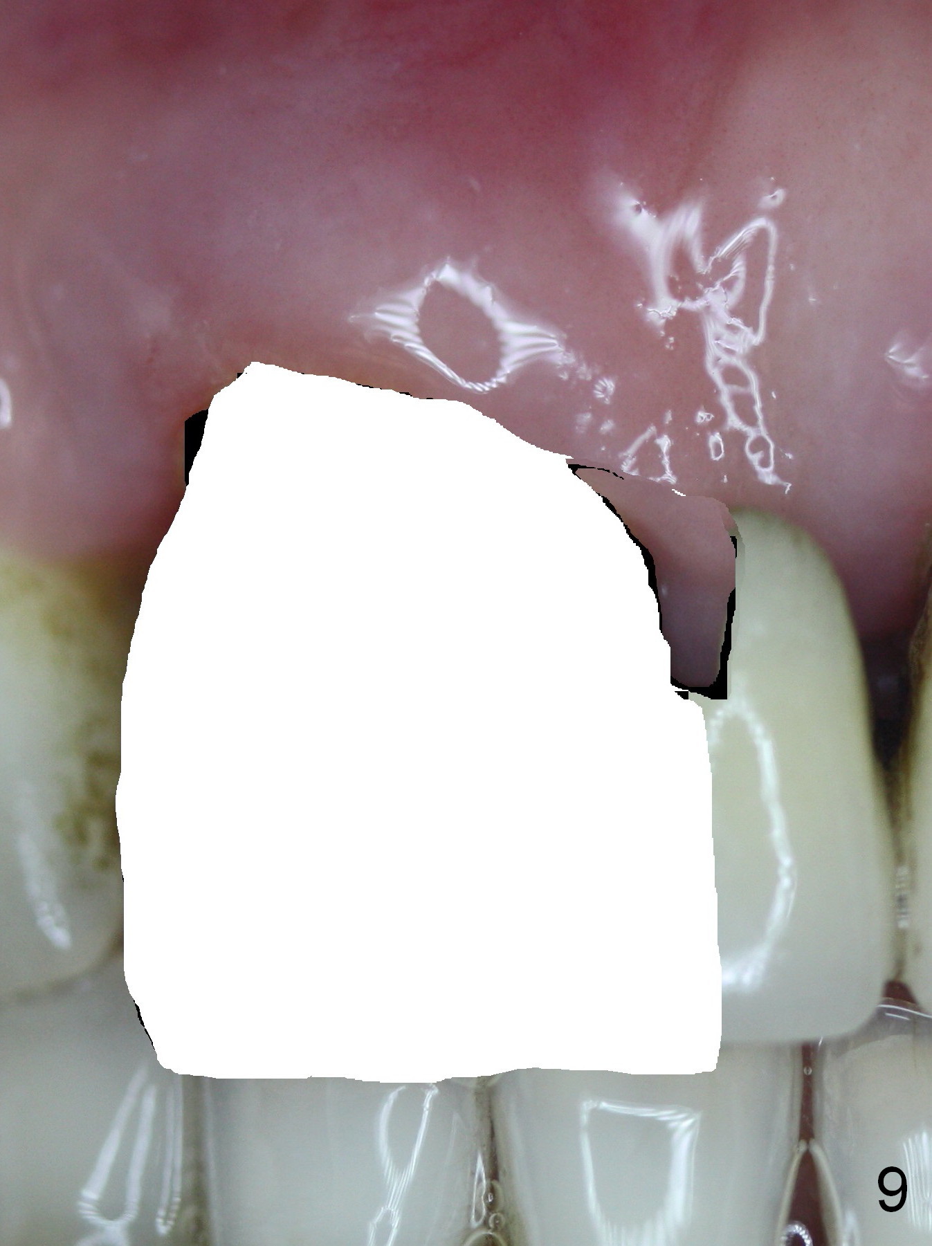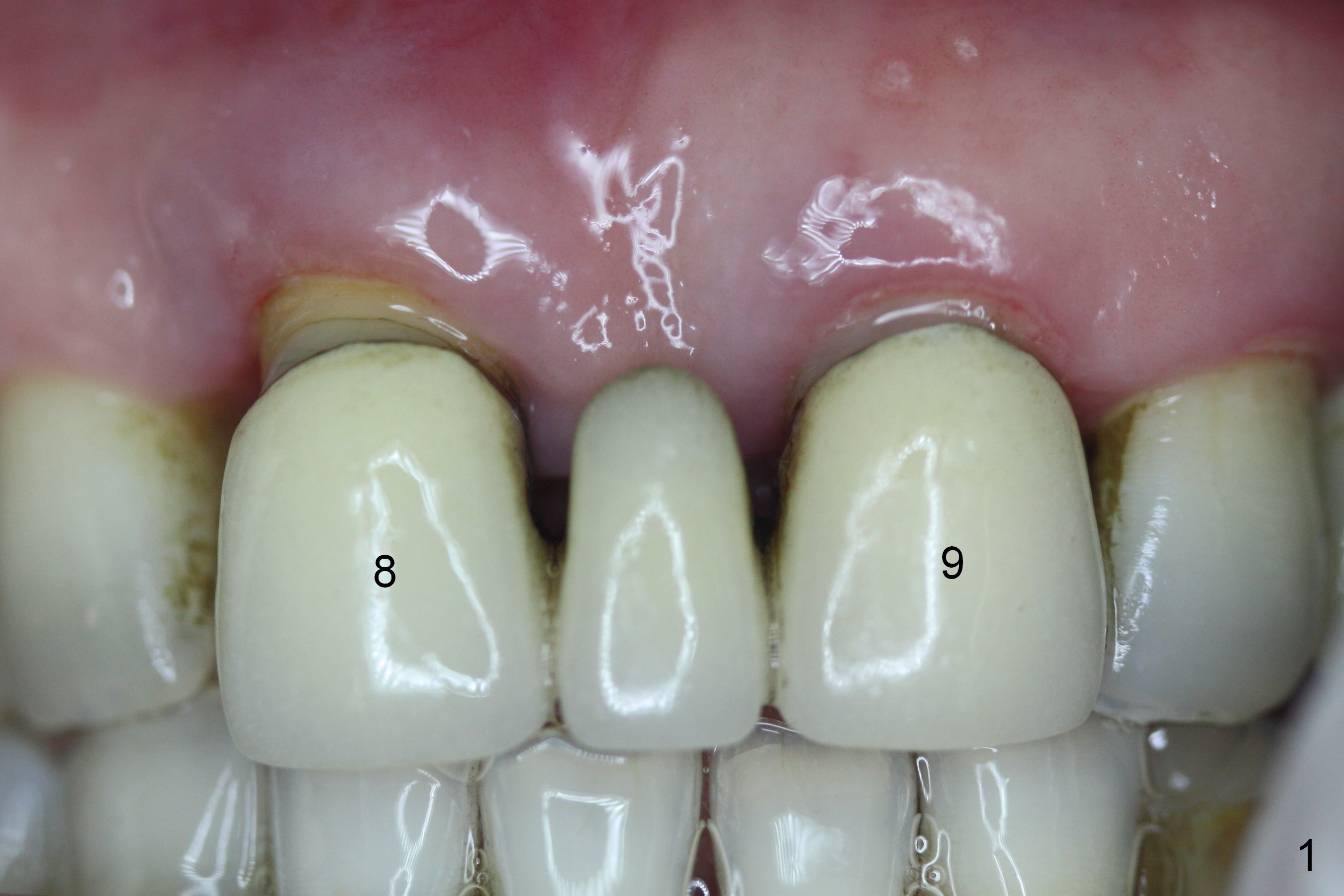 The 74-year-old patient is excited about having 3 implants placed without discomfort (1,2). He wants to take care of a loose FPD spanning from #8 to 9 (Fig.1). It appears that #8 is non-salvageable (Fig.2 * with deep pockets). There is severe bone loss around the affected tooth (Fig.3; Osteotape is expected for buccal and lingual defects). In addition, the Incisive Canal is abnormally large (arrowheads). The coronal end of a 4.5x20 mm implant and a 3.5x5 mm abutment will be slightly deviated mesially (Fig.4), since the 3-unit FPD will be converted to 2 single unit crowns. Surgical guide is ready. The 1st step is to section between #8 and the pontic (Fig.5; green outline: implant; red: abutment). If primary stability is low, the immediate provisional (Fig.8 white area) will be bonded the tooth #7 and the pontic as a supplementary measure (blue areas). Once the implant is osteointegrated, the distal portion of the pontic (Fig.7 *) will be removed. Acrylic is added to the mesial portion of the provisional (Fig.8 *) so that the papilla (P in Fig.7) will be pushed mesially and incisally (Fig.8 arrowheads). The step will be repeated a few weeks later (Fig.9). It could be done bilaterally at the same time by removing #9 crown and converting to the provisional. Finally the pontic will be removed. Two relatively wide crowns will be fabricated if the patient is satisfied with the provisional.