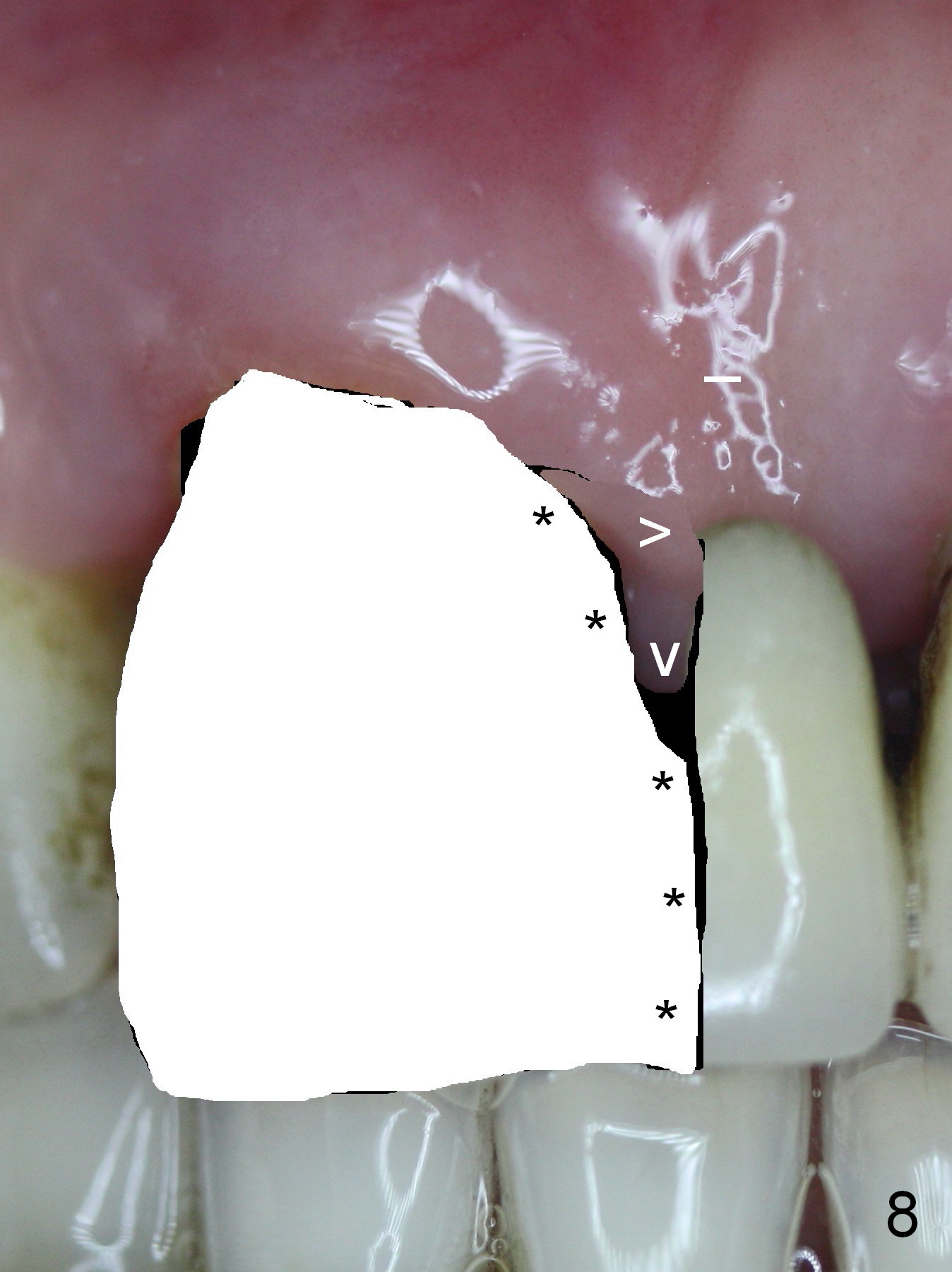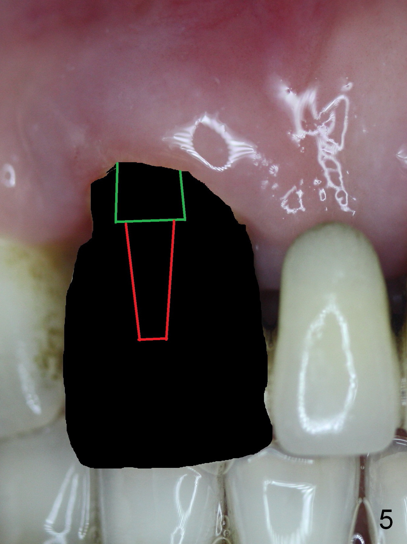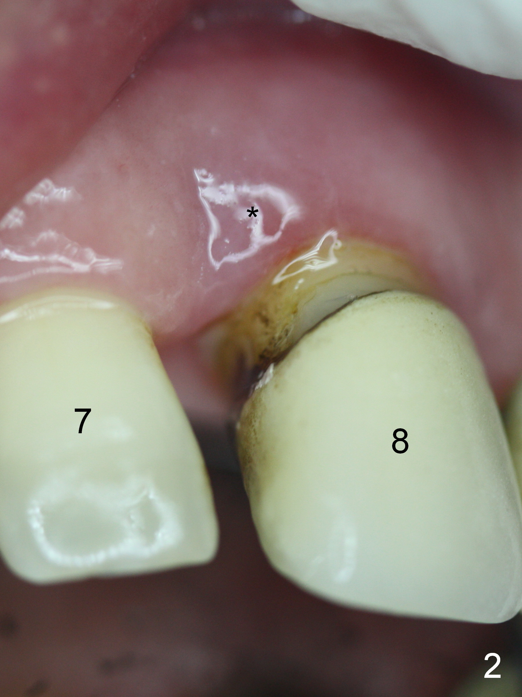 The 74-year-old patient is excited about having 3 implants placed without discomfort (1,2). He wants to take care of a loose FPD spanning from #8 to 9 (Fig.1). It appears that #8 is non-salvageable (Fig.2 * with deep pockets). There is severe bone loss around the affected tooth (Fig.3; Osteotape is expected for buccal and lingual defects). In addition, the Incisive Canal is abnormally large (arrowheads). The coronal end of a 4.5x20 mm implant and a 3.5x5 mm abutment will be slightly deviated mesially (Fig.4), since the 3-unit FPD will be converted to 2 single unit crowns. Surgical guide is ready. The 1st step is to section between #8 and the pontic (Fig.5; green outline: implant; red: abutment). If primary stability is low, the immediate provisional (Fig.8 white area) will be bonded the tooth #7 and the pontic as a supplementary measure (blue areas). Once the implant is osteointegrated, the distal portion of the pontic (Fig.7 *) will be removed. Acrylic is added to the mesial portion of the provisional (Fig.8 *) so that the papilla (P in Fig.7) will be pushed mesially and incisally (Fig.8 arrowheads). The step will be repeated a few weeks later (Fig.9). It could be done bilaterally at the same time by removing #9 crown and converting to the provisional. Finally the pontic will be removed. Two relatively wide crowns will be fabricated if the patient is satisfied with the provisional.
