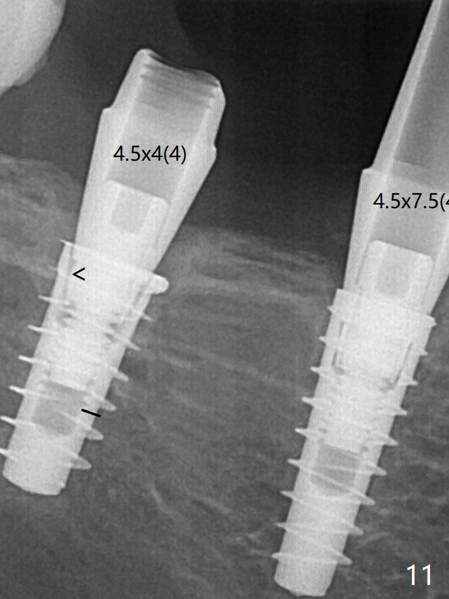 通过旋转7 基台,终于就位(图十二:箭头),螺丝往下移位(与图十一:横线对比),但是基台边缘太低,不利于取模。