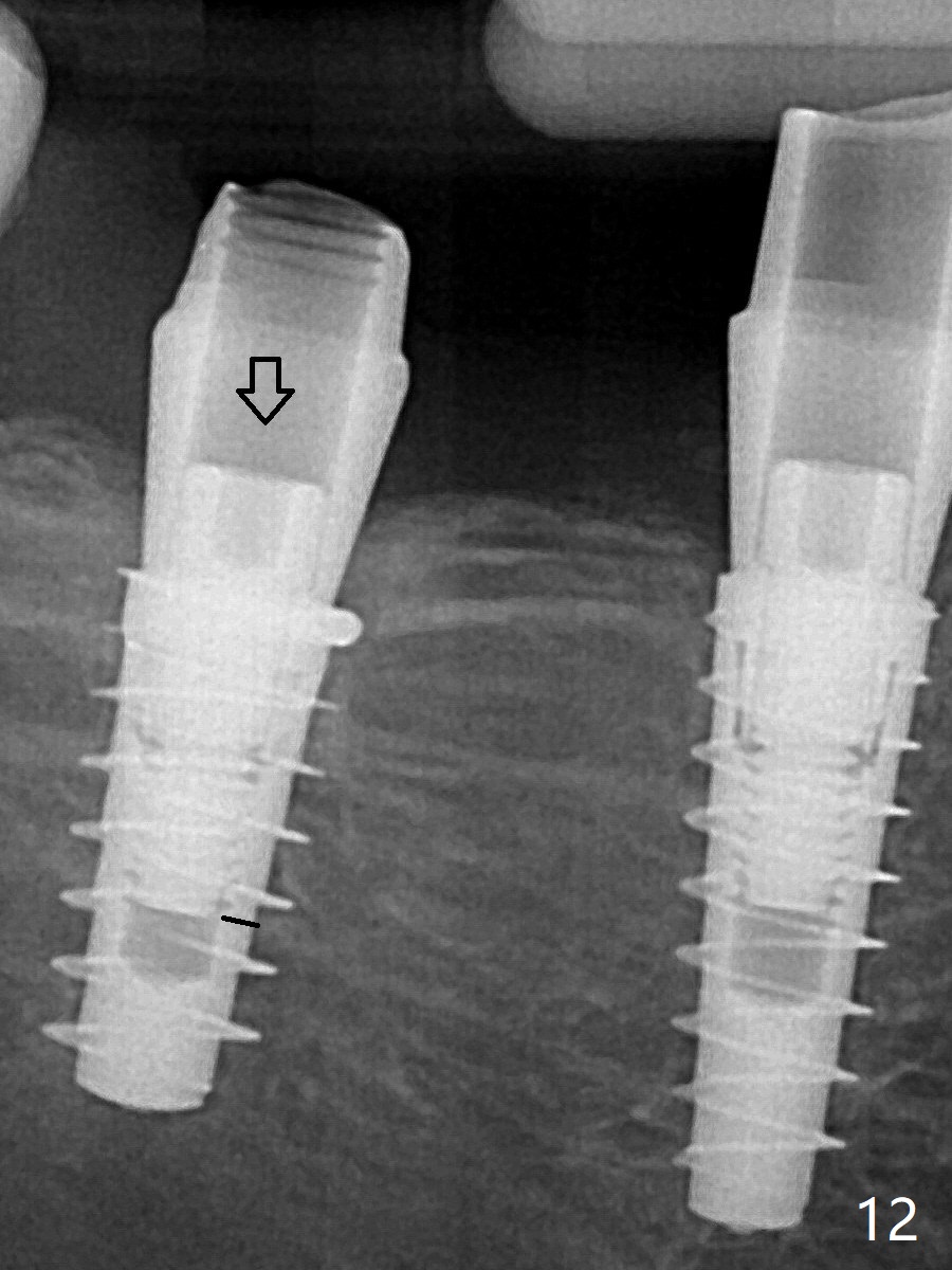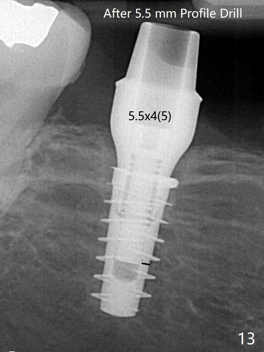 改用5.5x4(5)毫米UF(不同品牌)基台,临床上不能就位,局麻使用5.5毫米Profile Drill后,才能就位(图十三),螺丝下端超越最低螺沟(横线)。