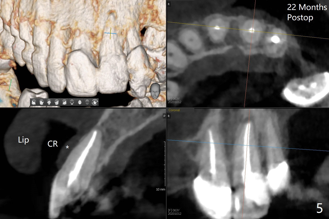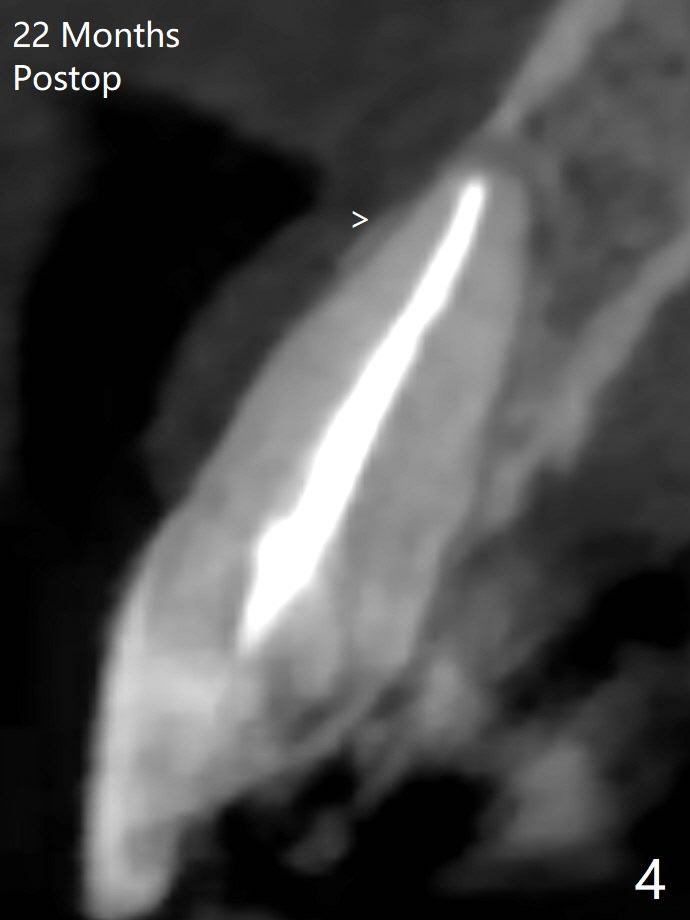 62岁女因牙痛(图一)做根管治疗(图二,三)。一年10个月后因11,13,30,31 植牙,拍摄CT,根尖阴影明显缩小(图四,五)。颊侧骨板薄而短(图四:>),牙槽骨也狭窄,如果需要植牙,比较困难。