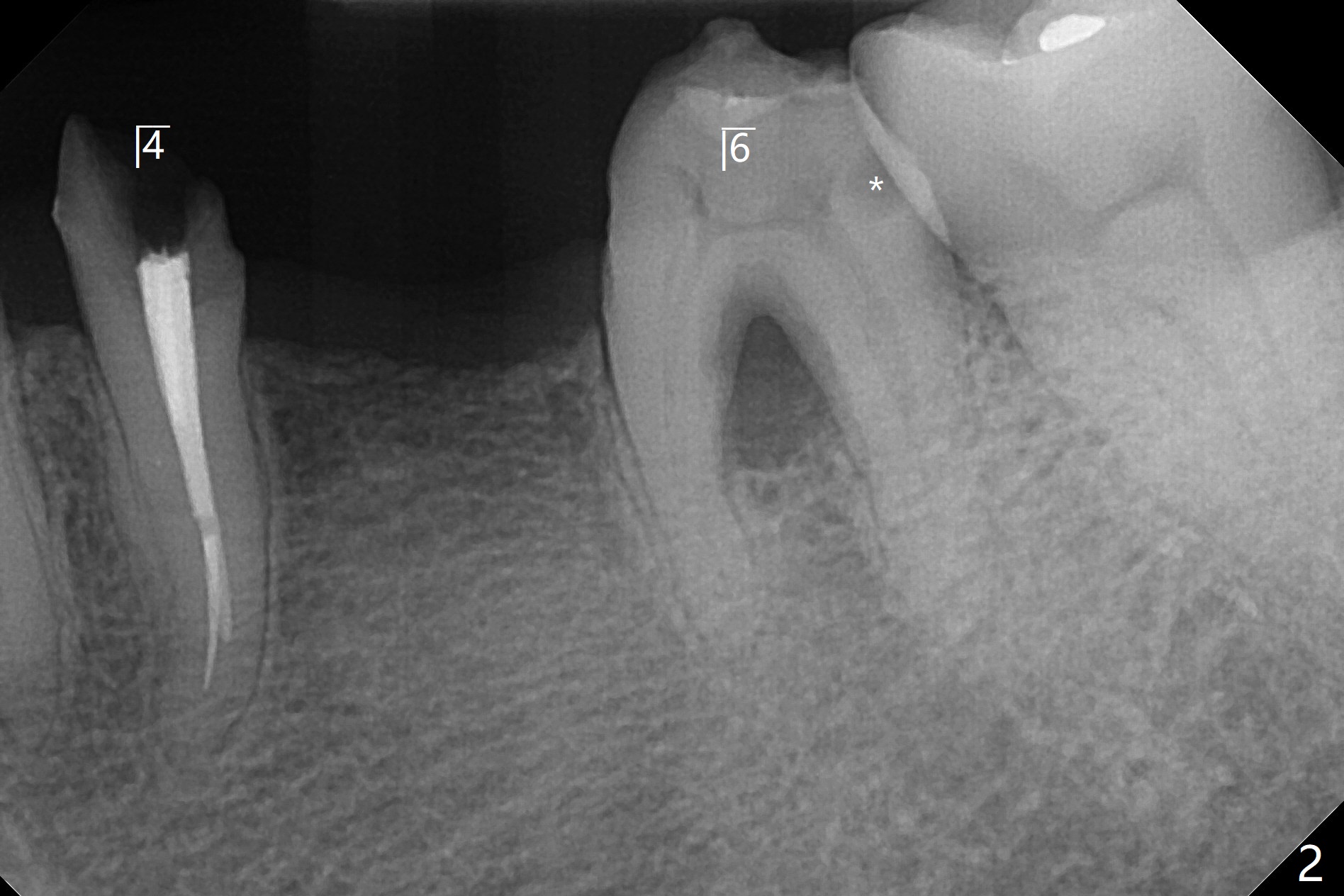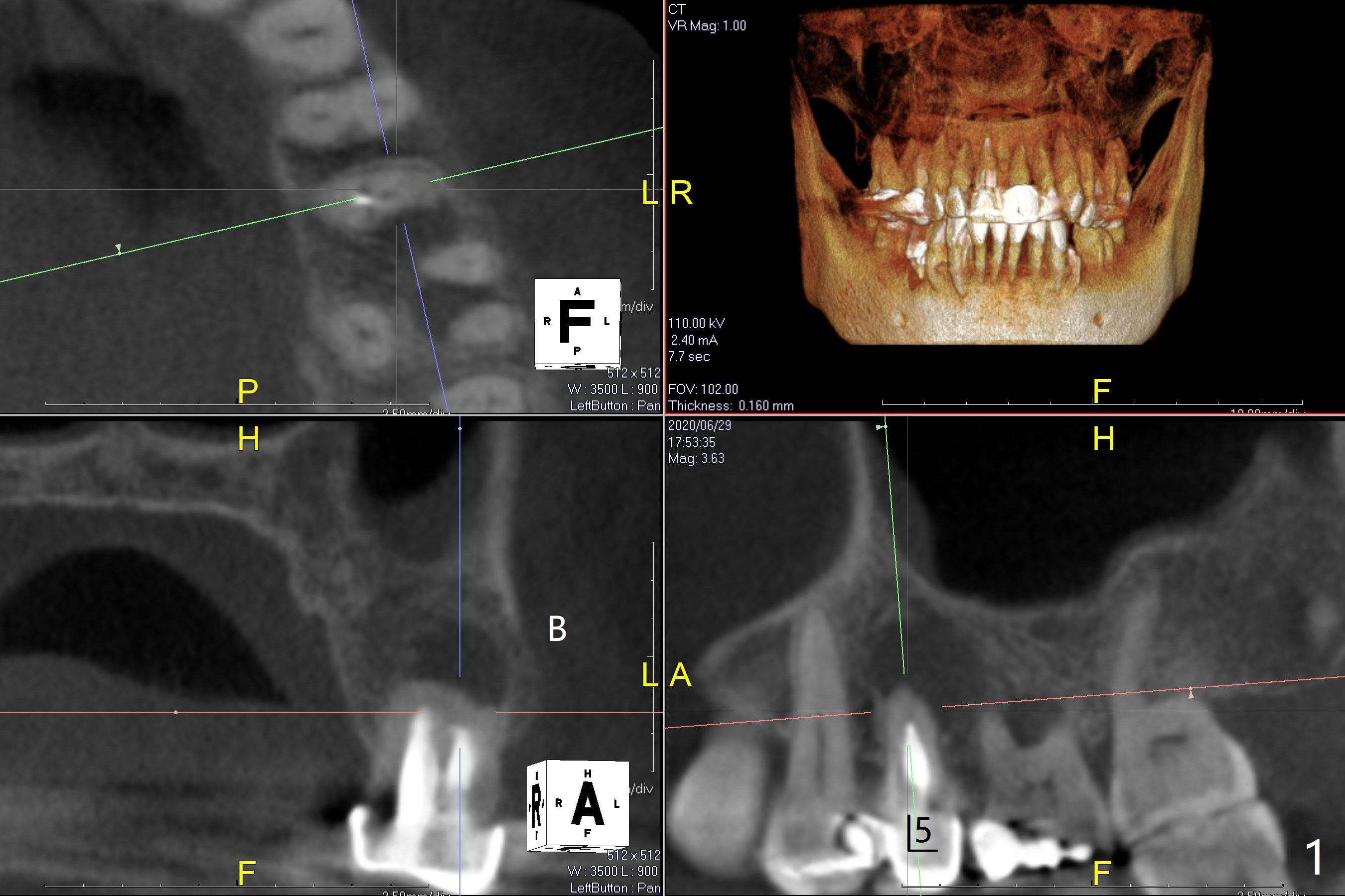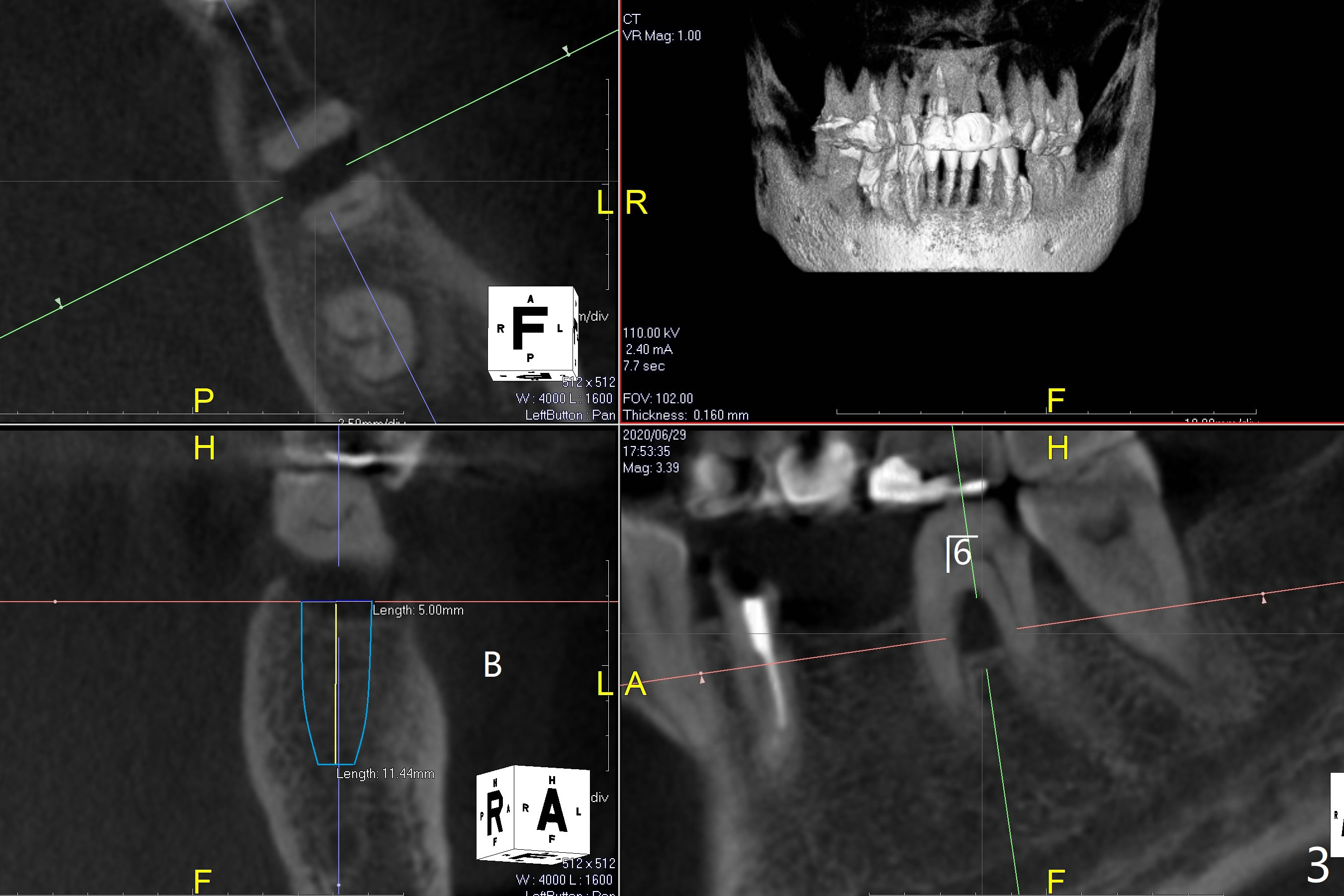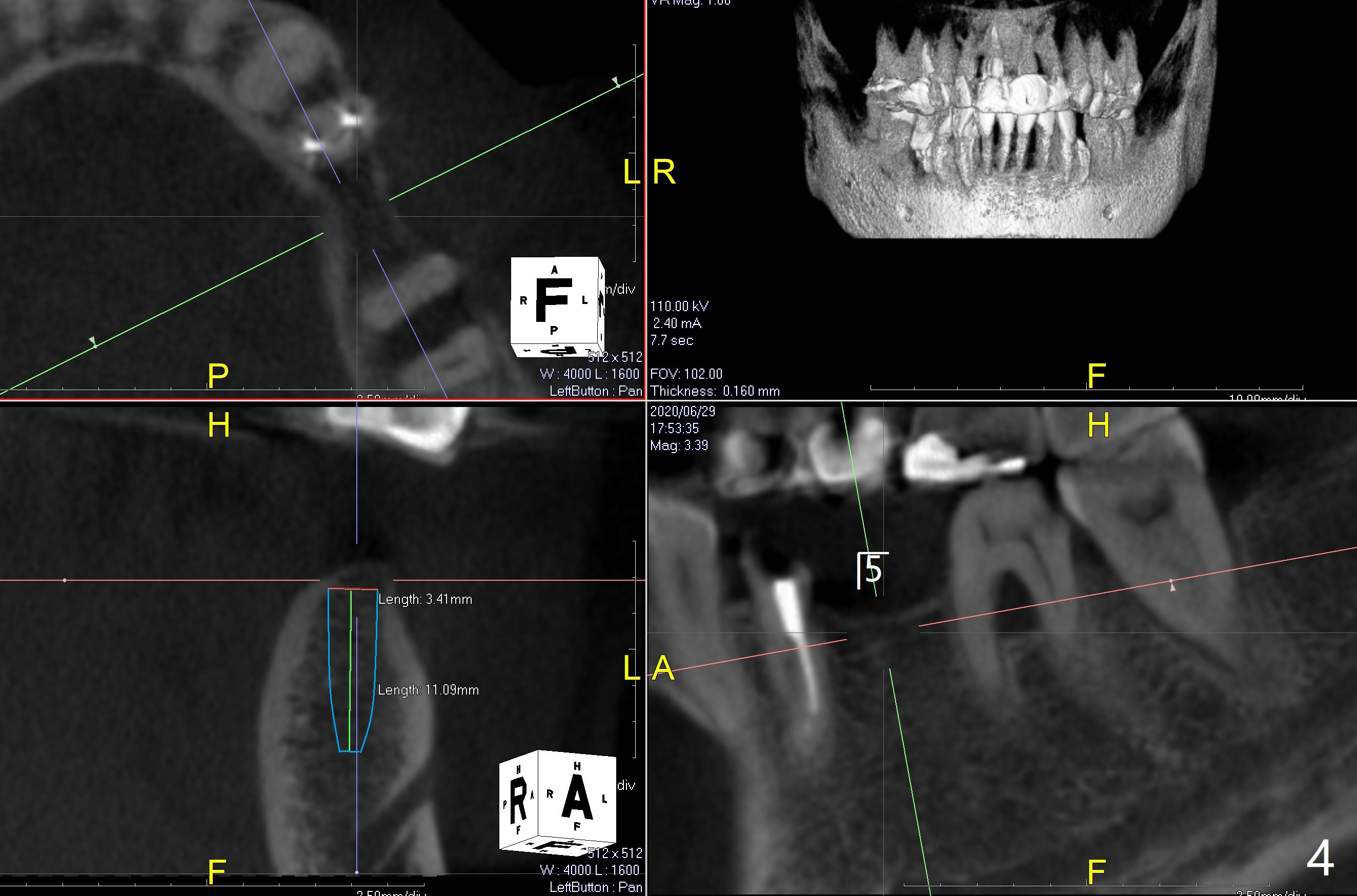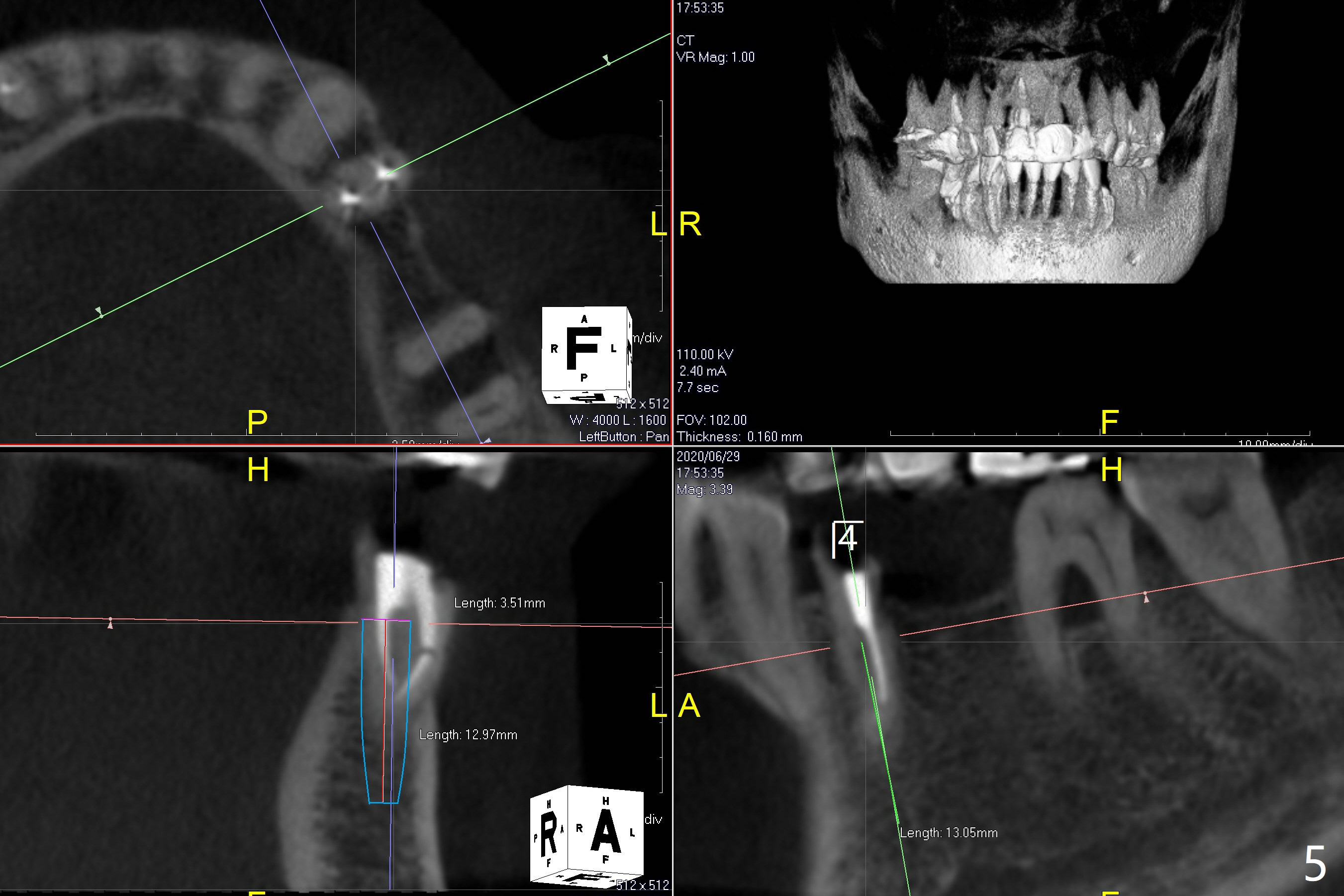 63岁女对肾上腺素和90%以上抗生素过敏,左上5(短根,巨大根尖阴影,图一),左下6(根分叉感染,远中龋齿(图二:*),左下4(牙齿断裂略微龈下:图二,五)似乎很难保留,左下5骨质宽度,高度也允许植牙(图四)。由于左上5需要提升术,可能出现上颌窦感染,Z Pack是否引起过敏反应不确定,拔牙植骨与提升植牙分期做(术前拍摄根尖片)。而下颌一期完成。
