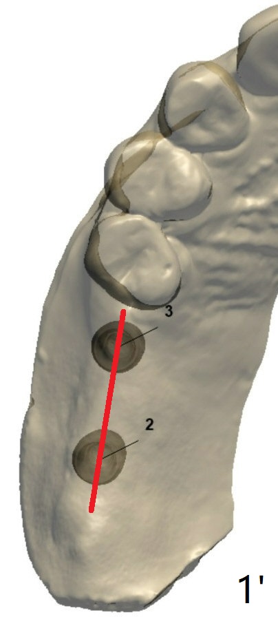 切开,钻洞,提升,牙槽嵴劈开(图1':红线),植入植体(骨扩张),骨粉