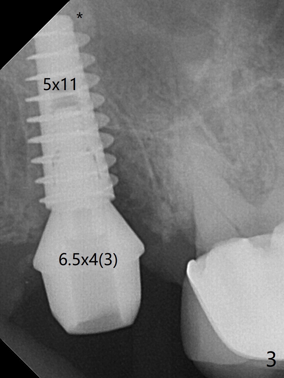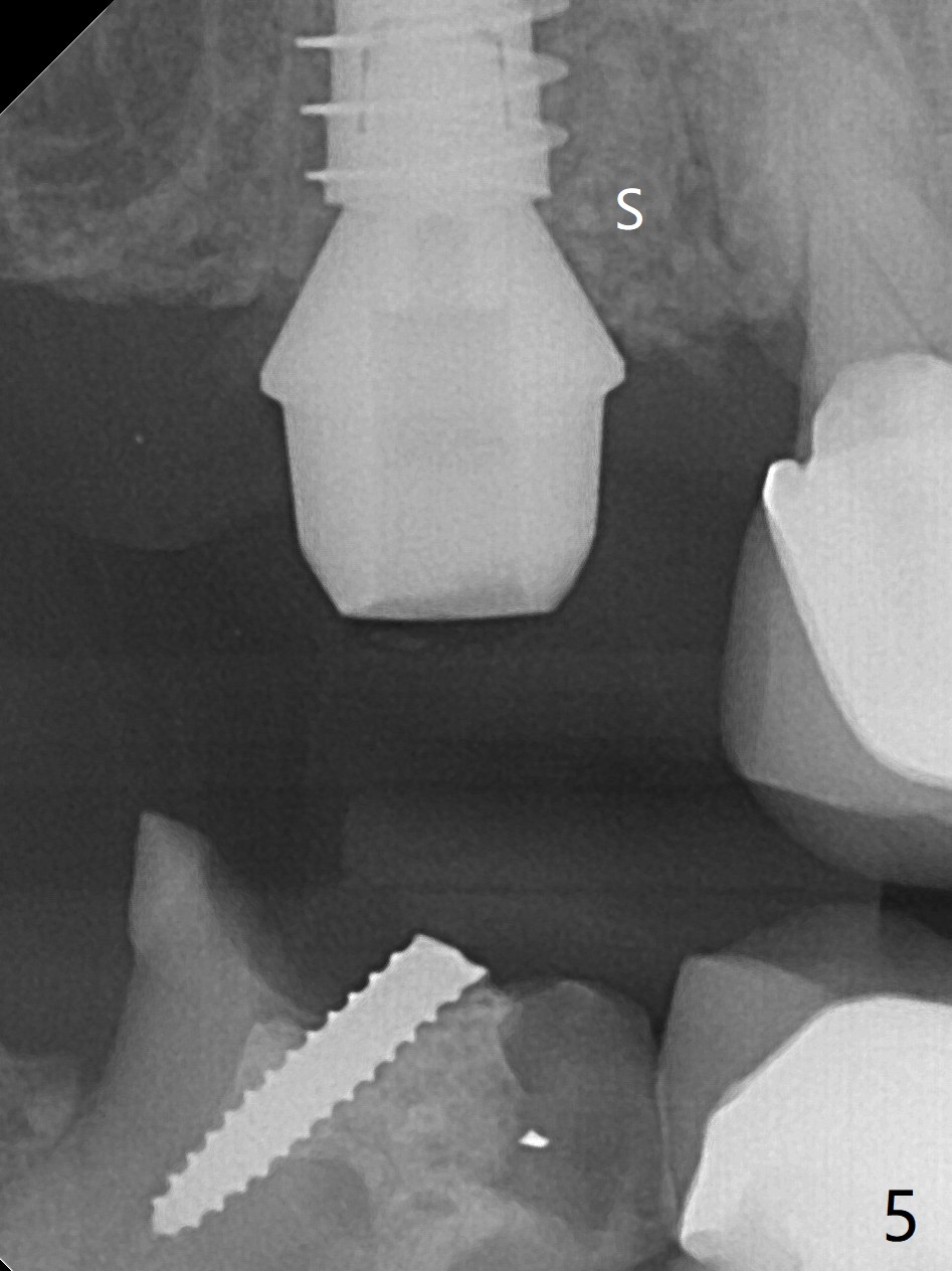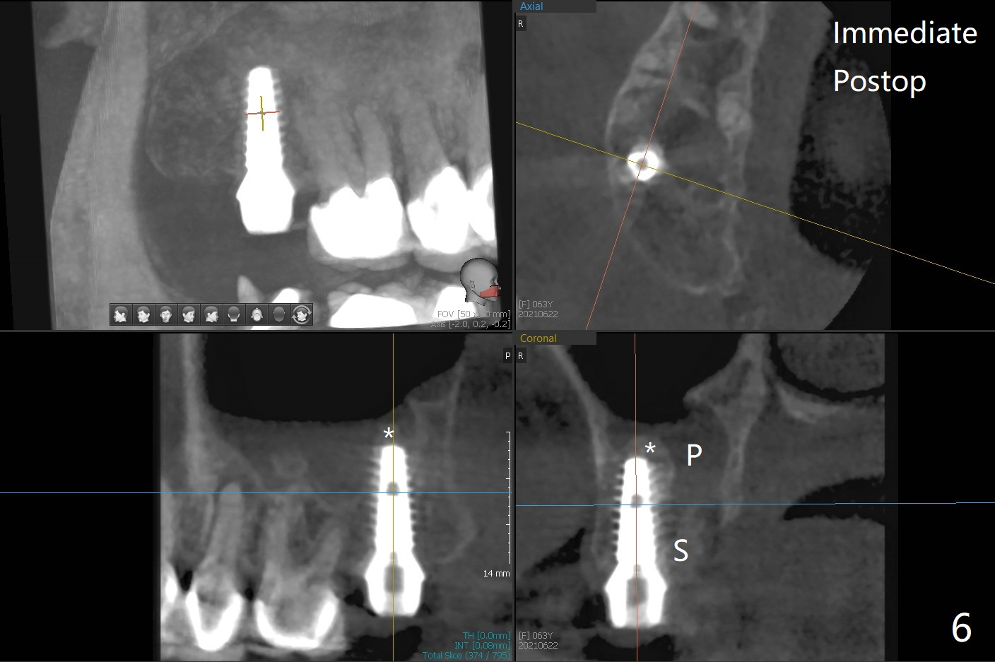 When the tooth #2 is extracted, there is sinus perforation in the palatal apex, consistent with preop CT (Fig.1: P). There is no bone shaving associated with drill sequence in the buccal socket (until 3.5x8.5 mm). With sticky bone and 4.5x10 mm IS dummy implant, sinus lift does not happen. Sinus floor perforation is felt when a 2.2x10 mm drill is used slowly. But air leaks from the palatal socket. With bone graft, a 4x10 mm dummy implant lifts the sinus (Fig.2). After further graft and 4.5x10 mm dummy implant, a 5x11 mm final implant is placed with 15 Ncm with sinus lift (Fig.3,4 *). Following abutment insertion, sticky bone is packed around the implant and abutment (Fig.5,6 S). Prior to final implant placement, a small piece of PRF and collagen and Osteogen Plugs are placed in the palatal socket for repair. Before discharge, there is mild nasal hemorrhage.